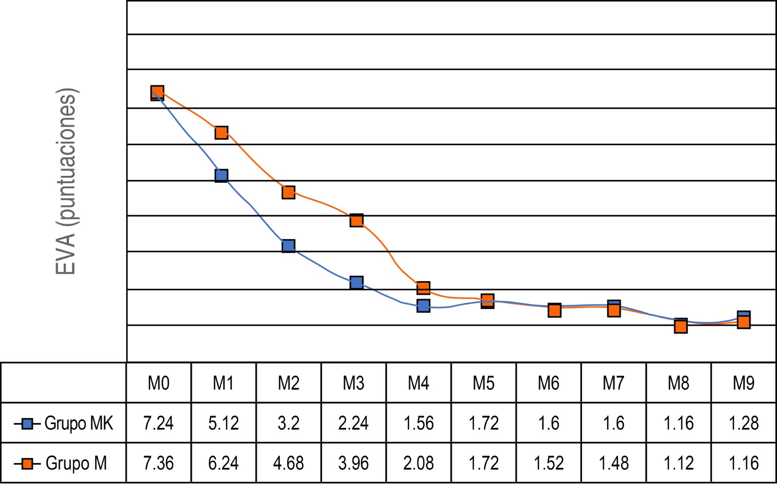 Al observar el comportamiento del dolor durante el tiempo para cada uno de los grupos, véase que en el grupo MK el valor más alto resultó ser en el momento M0 (7.24 ± 0.93 puntos) para luego descender progresivamente hasta el momento M9, en la cual alcanzó valores de 1.28 ± 0.46 puntos. El grupo M tuvo el mismo comportamiento con un valor más elevado en el momento M0 (7.36 ± 1.32 puntos) y el más bajo en el momento M9 (1.16 ± 0.37 puntos). Al aplicar prueba de Friedman para el comportamiento de la intensidad del dolor a través del tiempo pudimos constatar cambios muy significativos (p = 0.000) en el comportamiento de la intensidad del dolor para cada uno de los grupos estudiados.