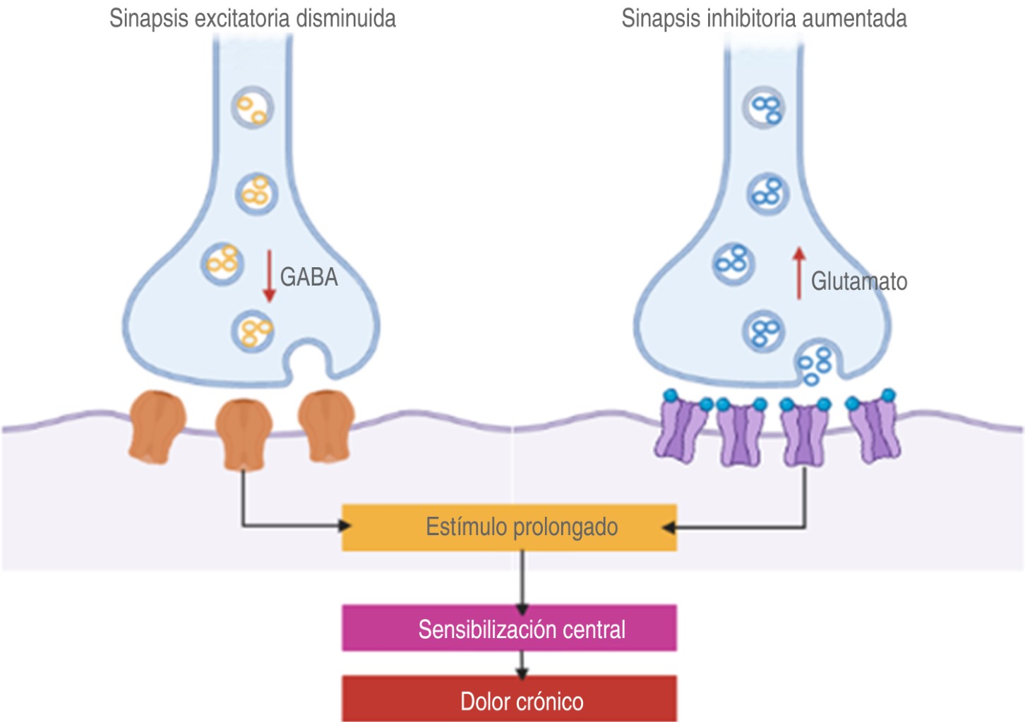 Los nociceptores o fibras Aδ y C al activarse participan en la liberación de sustancias sensibilizantes (prostaglandinas, bradicinina, serotonina, sustancia P, histamina, citocinas, etcétera). El dolor se transmite y llega a la asta dorsal de la médula espinal: desde ahí la información se envía en dos direcciones: de vuelta a la periferia, iniciando una reacción de retirada (conciencia autónoma) y simultáneamente a la región talámica y otras regiones que funcionan como vías de relevo hacia la corteza cerebral. Durante la respuesta dolorosa, el sistema nervioso sufre una polarización excitatoria (Figura 1)(6-9).