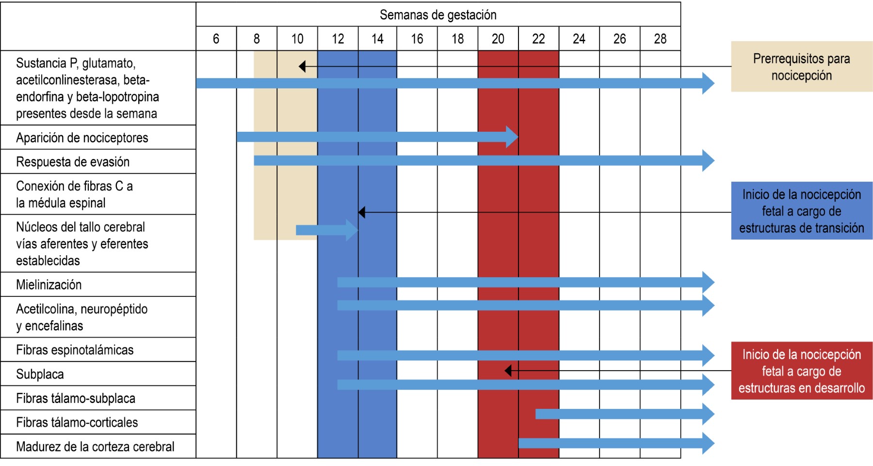 A partir de la semana 12 se reporta la aparición de la subplaca, la cual cumple las funciones de la corteza cerebral desde la semana 12 hasta la 35, período en el que va involucionando hasta desaparecer a los tres meses postnatales; al mismo tiempo se va desarrollando la corteza, la cual se va estableciendo desde la semana 24. Paralelamente se observa la expresión de neuromediadores del dolor (Figura 2)(9,13,15).