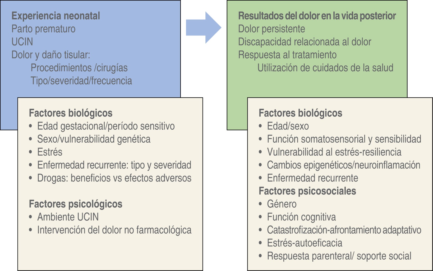 El feto cuenta con todas las estructuras primordiales inmaduras para sentir dolor en la semana 12, sin embargo, la terminología actual sólo describe esto como presencia de nocicepción. Aspectos importantes como la prematurez interfieren en la percepción del dolor, ya que predispone al requerimiento de una UCIN y de procedimientos dolorosos; esto condiciona a alteraciones en el neurodesarrollo y desarrollo psicosocial, así como a la percepción de dolor en la vida futura.