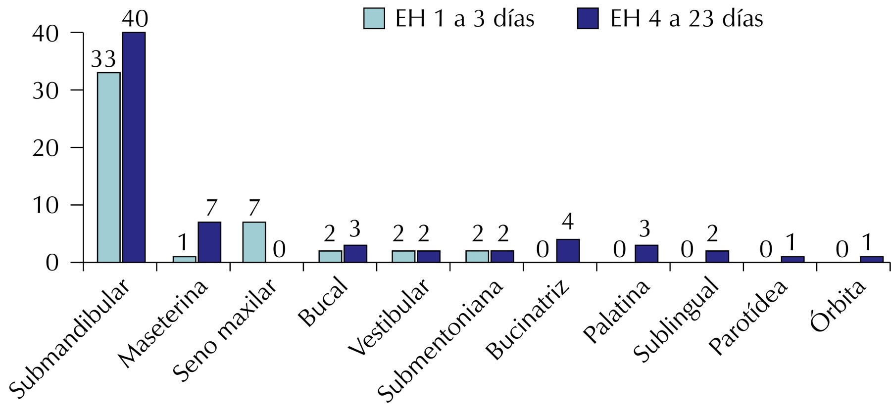 La combinación de antibióticos intrahospitalaria más empleada fue clindamicina con ceftriaxona. Las terapéuticas antibióticas aplicadas permitieron la resolución de los AO, egresando al 99% de pacientes por mejoría. Se registró una defunción: una mujer de 79 años que padecía de diabetes, hipertensión y secuelas de un evento vascular cerebral. Antes de ser hospitalizada, le realizaron una extracción de tercer molar desarrollando un AOCF; al ingreso, presentó fiebre, leucocitosis mayor de 15,000 leucos/mL, trismus y afectación de múltiples espacios fasciales. El absceso fue drenado bajo anestesia general, el cultivo bacteriológico del pus identificó Enterococcus faecium, se ingresó a sala de cuidados intensivos, recibió triple esquema antibiótico; sin embargo, desarrolló choque séptico y falleció 23 días después de su ingreso. Esta paciente presentó factores que: 1) incrementan la EH, 2) afectan el pronóstico, 3) condicionan el desarrollo de complicaciones que atentan contra la vida y 4) determinan un resultado clínico desfavorable; además, fue el caso que generó mayor EH en nuestro estudio.