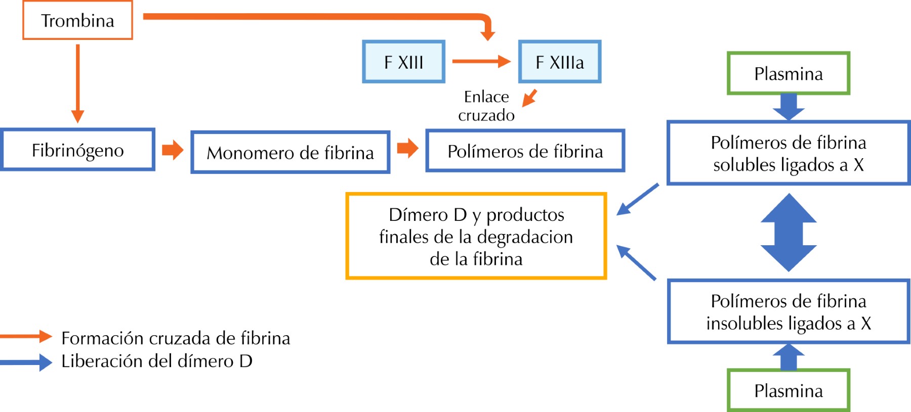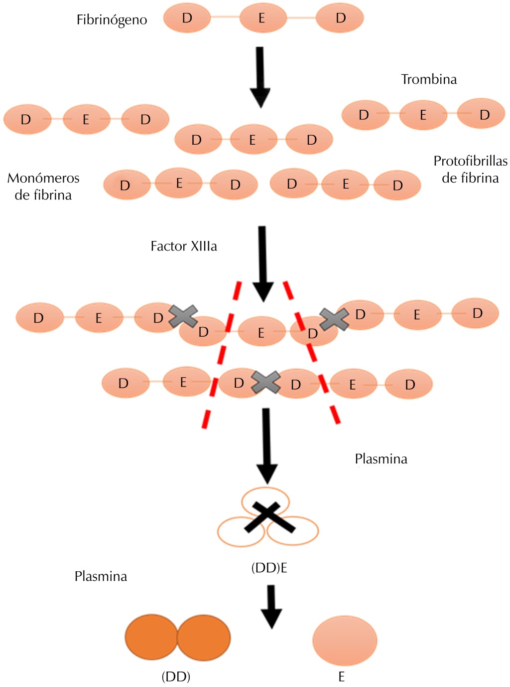 Las concentraciones de DD plasmático son indicativos de la presencia de fibrina en la circulación y sirve como indicador serológico de la activación de la coagulación y del sistema fibrinolítico.10,11 Para que se genere DD es esencial la participación y activación de tres enzimas: trombina, factor VIII activado y plasmina. La trombina y la plasmina son dos enzimas que representan los puntos finales de la activación de la coagulación y la fibrinólisis, respectivamente.9,11,12