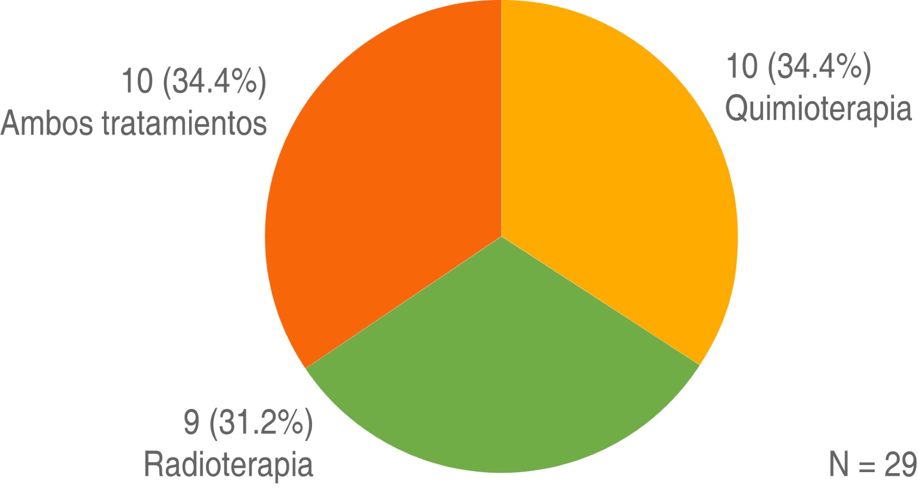 De las 29 pacientes estudiadas, 10 (34.4%) fueron sometidas únicamente a quimioterapia (QT), nueve (31.2%) a radioterapia (RT) y 10 (34.4%) a ambos tratamientos (Figura 1).