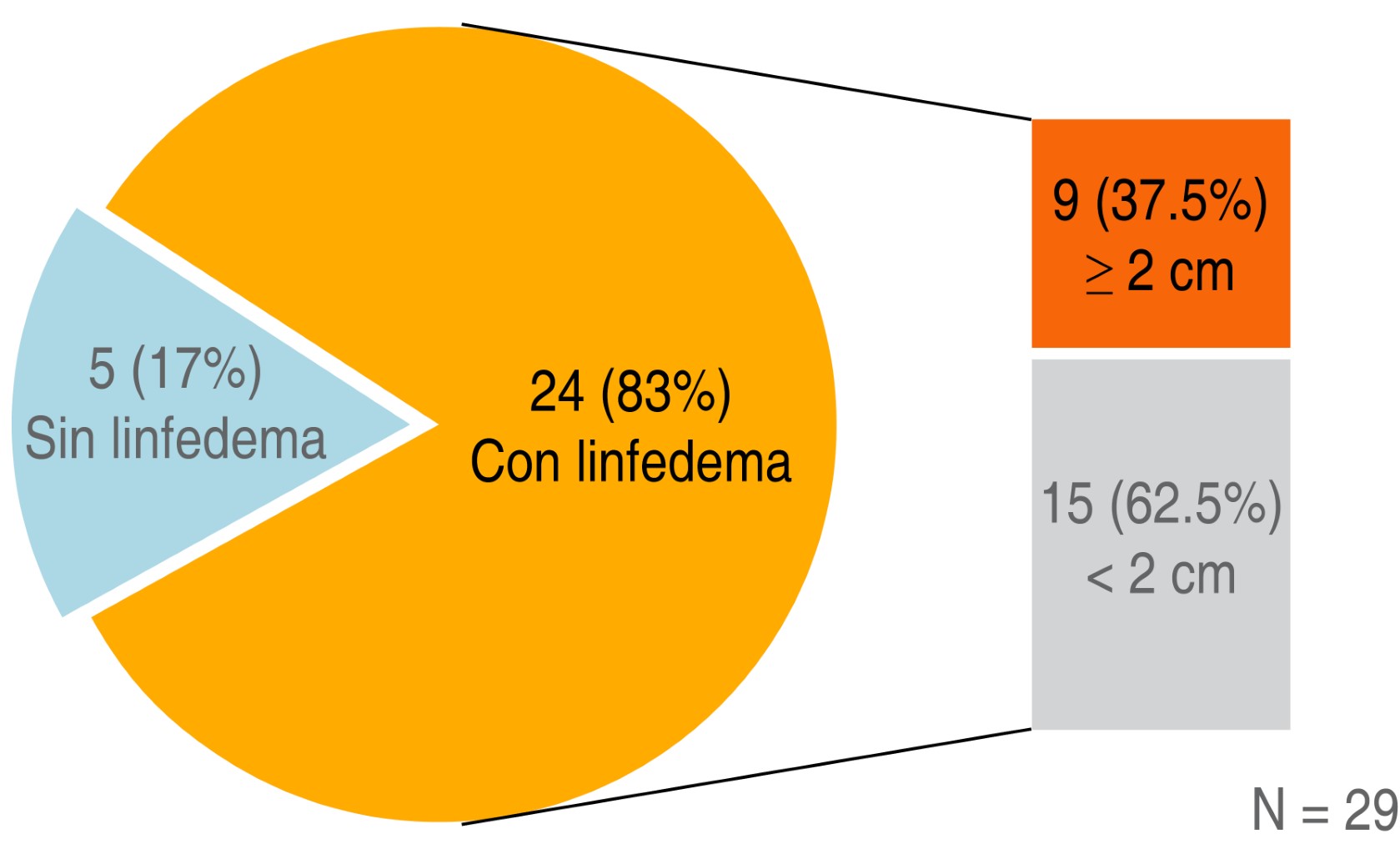 Por otra parte, 24 (83%) de las pacientes presentaron linfedema, de las cuales nueve (37.5%) presentaron linfedema ≥ 2 cm y 15 (62.5%) < 2cm (Figura 2).15