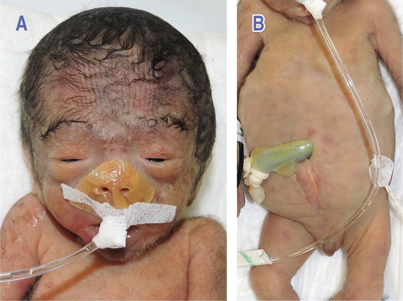 Estos pacientes pueden presentar malformaciones genitales en 3-8% de los casos y anomalías de las vías urinarias en 14-21%.5,6 La anomalía de prune-belly (APB), conocida también como síndrome de Eagle-Barrett o de la tríada (músculos abdominales flácidos, anomalías del tracto urinario y criptorquidia) es una malformación genitourinaria que se ha reportado excepcionalmente en el SE.7 El objetivo del presente trabajo es informar sobre un RN masculino con SE y APB.