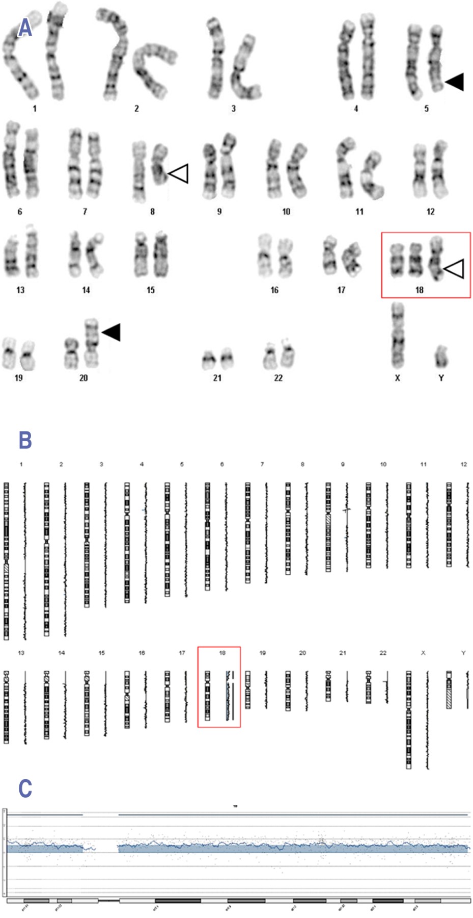 Se realizó cariotipo en sangre periférica con un nivel de resolución de 450 bandas, el resultado fue: 47,XY,t(5;20)(q22;p11.2),t(8;18)(q22;q11.2),+18 (Figura 2A). Mientras que por microarreglos basados en hibridación genómica comparativa (aCGH), con resolución 60K se encontró: arr(18)×3 (Figura 2B), lo que indicó ganancia de copia simple de todo un cromosoma 18 (Figura 2C); el patrón genómico corresponde a sexo masculino, sin detectar ninguna otra pérdida o ganancia genómica.