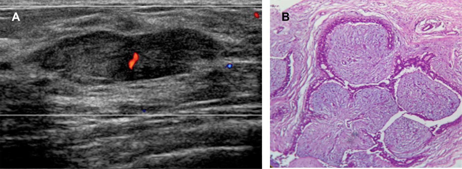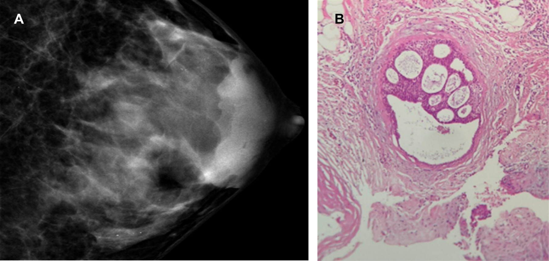 La papilomatosis múltiple, que es una entidad poco frecuente, se ha asociado a un potencial premaligno. Se caracteriza por la presencia de proyecciones papilares con un centro revestido por células epiteliales y mioepiteliales que ocupan la luz dilatada de los ductos terminales (Figura 2B).6