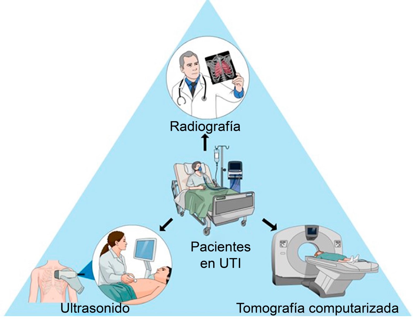 El estudio de la patología de tórax en un paciente hospitalizado en la Unidad de Terapia Intensiva (UTI) puede ser clasificado en, al menos, dos contextos; el primero y más común es por el método de imagen en el que se visualizan las patologías. En esta primera clasificación las patologías se agrupan en tres categorías de acuerdo con la modalidad diagnóstica (método de imagen): radiografía simple, ultrasonido y tomografía; la Figura 1 muestra los métodos de imagen utilizados en el diagnóstico y clasificación de patologías torácicas.