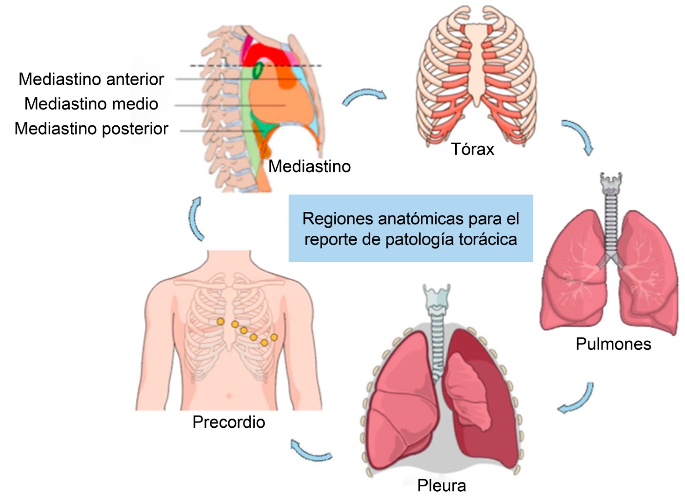 Una segunda clasificación de las patologías del tórax consiste en agruparlas con base en las regiones anatómicas en que se estudia el tórax; esta última clasificación ha sido la preferida de algunos libros especializados en imagenología torácica.1 La Figura 2 muestra las regiones anatómicas utilizadas en la clasificación de patologías torácicas en la UTI.