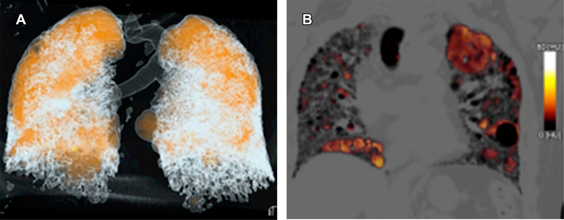 Por otra parte, los hallazgos que con mayor frecuencia se encuentran en la tomografía son infiltraciones micronodulares difusas en el intersticio, con nódulos que van de los dos a 4 mm de diámetro. Signos como opacidad en vidrio despulido, consolidaciones, linfadenopatía y derrame pleural son observadas con menor frecuencia.30 A pesar de que el proceso de la neumonía intersticial linfocítica es difuso, tiene más propensión a ser más grave en el intersticio perilinfático a lo largo de los haces broncovasculares, los tabiques interlobulillares y en la pleura.29 La tomografía de energía dual, conocida también como tomografía espectral, permite la realización de protocolos de perfusión y la generación de mapas de yodo, que cuantifican volúmenes pulmonares y porcentajes de perfusión pulmonar adicionalmente a la angiotomografía pulmonar; estas técnicas adicionales proporcionan información valiosa en pacientes con enfermedad intersticial difusa severa, que además de identificar trombos, pueden apoyar al médico tratante a identificar pacientes que requieren apoyo ventilatorio en la UTI (Figura 5).