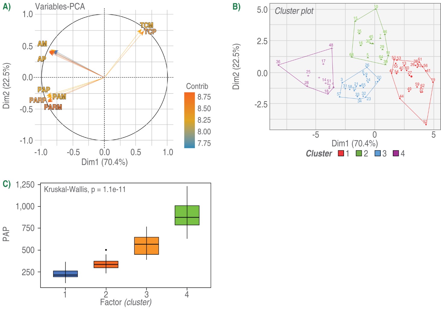 El análisis de componentes principales realizado en R consta de cinco etapas: 1) normalización de los datos; 2) cálculo de los valores PCA para cuantificar como aportan las dimensiones y el porcentaje de varianza de cada parámetro; 3) análisis de contribución de cada uno de los parámetros que componen la prueba (Figura 1A); 4) la variable más sensible se divide en cuatro grupos utilizando el método k-medias (Figura 1B); y 5) se realiza prueba estadística para validar las diferencias entre los grupos propuestos (Figura 1C).