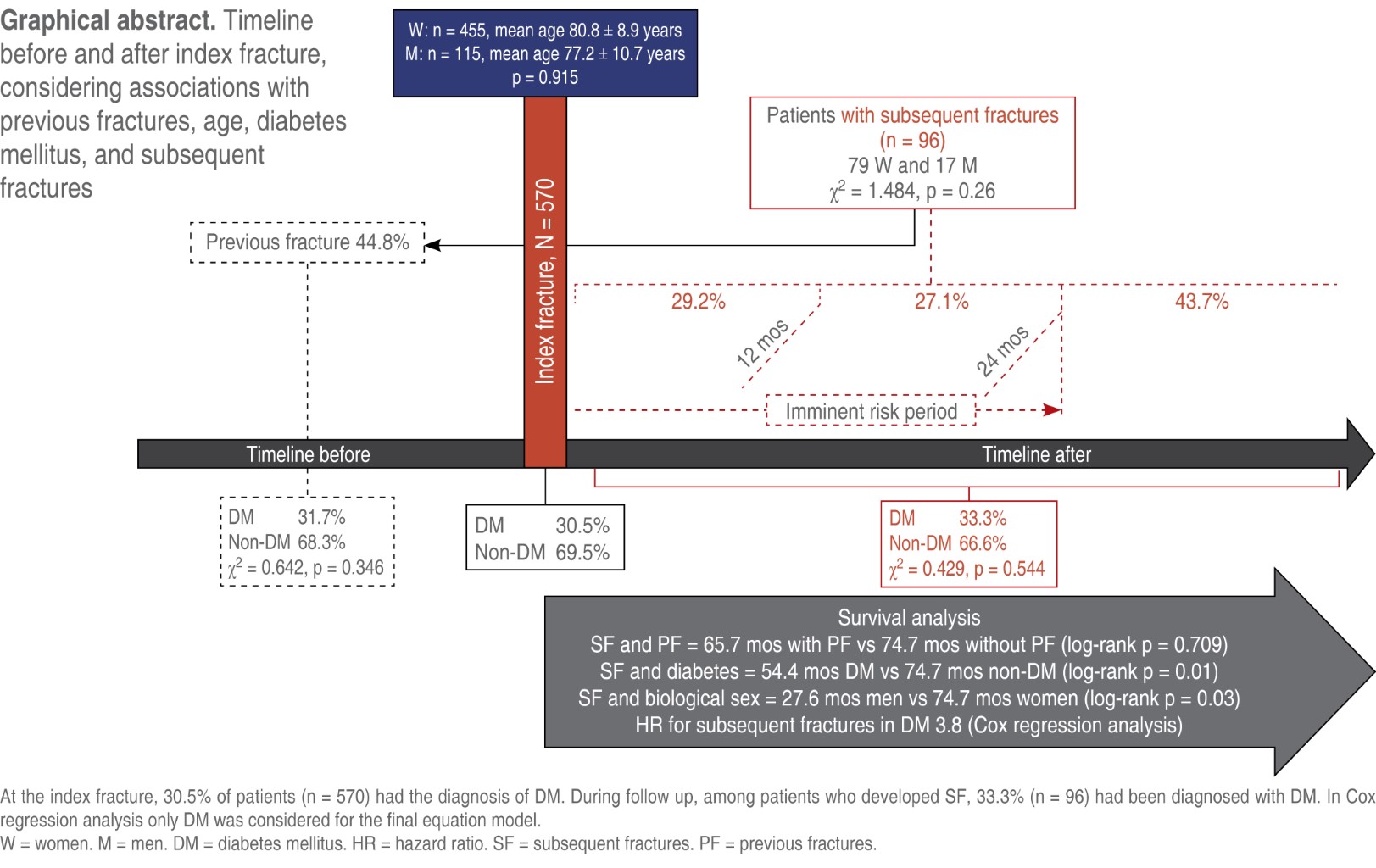 Resultados: se incluyeron 570 pacientes, edad media de 80.09 ± 9.45 años, 79.8% sexo femenino. Seguimiento de 24.8 ± 20.8 meses. En 96 casos ocurrieron fracturas subsecuentes en un tiempo de 25.9 ± 19.5 meses; de éstos, 56.2% ocurrió antes de dos años posteriores a la fractura índice. No se observaron asociaciones para segundas fracturas entre fractura previa (p = 0.3), sexo (p = 0.265) y diabetes (p = 0.54). El análisis de supervivencia demostró asociación para segundas fracturas con diabetes (p = 0.01) y sexo biológico (p = 0.03). La regresión de Cox demostró riesgo incrementado para diabetes (HR = 3.8; p = 0.017; IC 95% 1.275-11.484).
