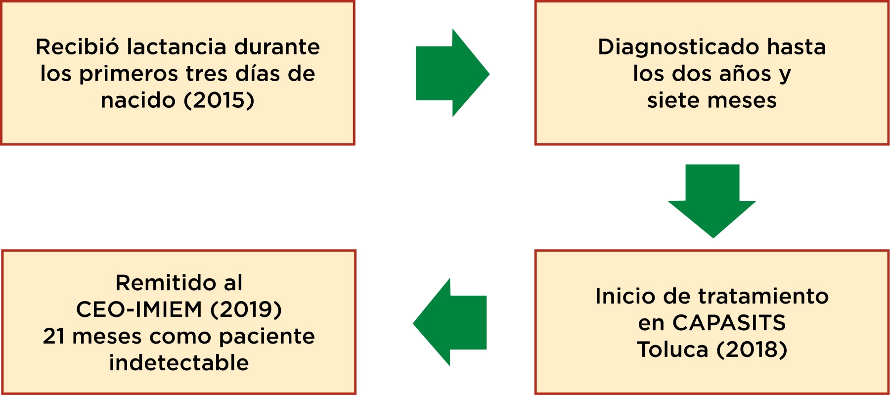 Paciente masculino originario de Temoaya, México, de cuatro años y tres meses de edad, nacido por parto distócico, con llanto espontáneo, sin complicaciones al nacimiento, con un peso de 3.360 kg; la madre refiere que el paciente adquirió infección de VIH por vía vertical, a través de la lactancia y que se encuentra bajo tratamiento antirretroviral (lopinavir/ ritonavir "Kaletra" 2.5 mL/12 h, abacavir 6.5 mL/12 h y lamivudina 6.5 mL/12 h). Fue hospitalizado a los 18 meses por un cuadro de gastroenteritis, sin complicaciones, no refiere ninguna alergia y cuenta con esquema de vacunación completo.