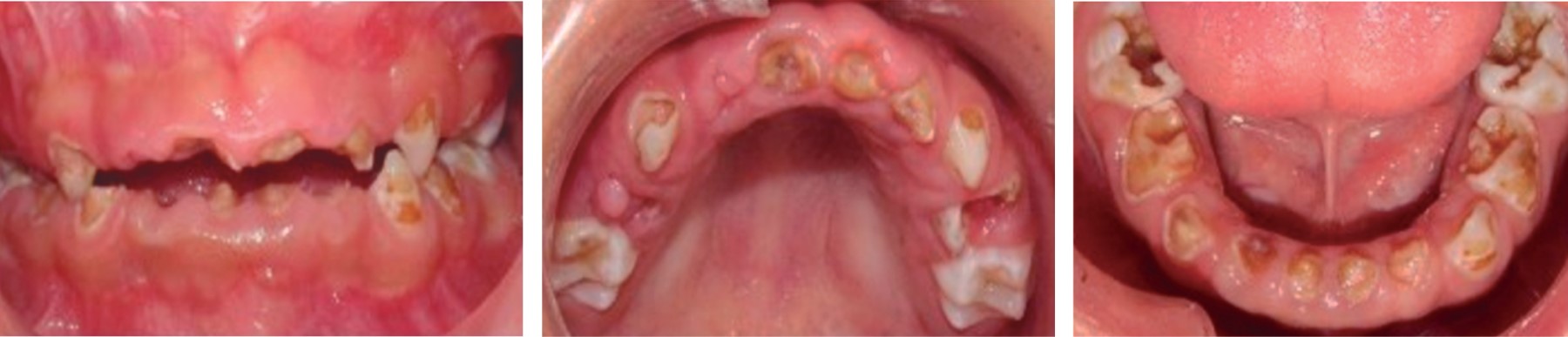 Durante la exploración física y el examen intraoral del paciente se observó higiene bucal deficiente, con lesiones cariosas de segundo, tercer y cuarto grado, diagnosticado con caries de la infancia temprana severa y gingivitis generalizada (Tabla 2). El paciente en el momento del examen oral presentaba dentición temporal, paladar profundo oval, lengua saburral, frenillos bien implantados a excepción del frenillo lingual, el cual se observó corto (Figura 2).