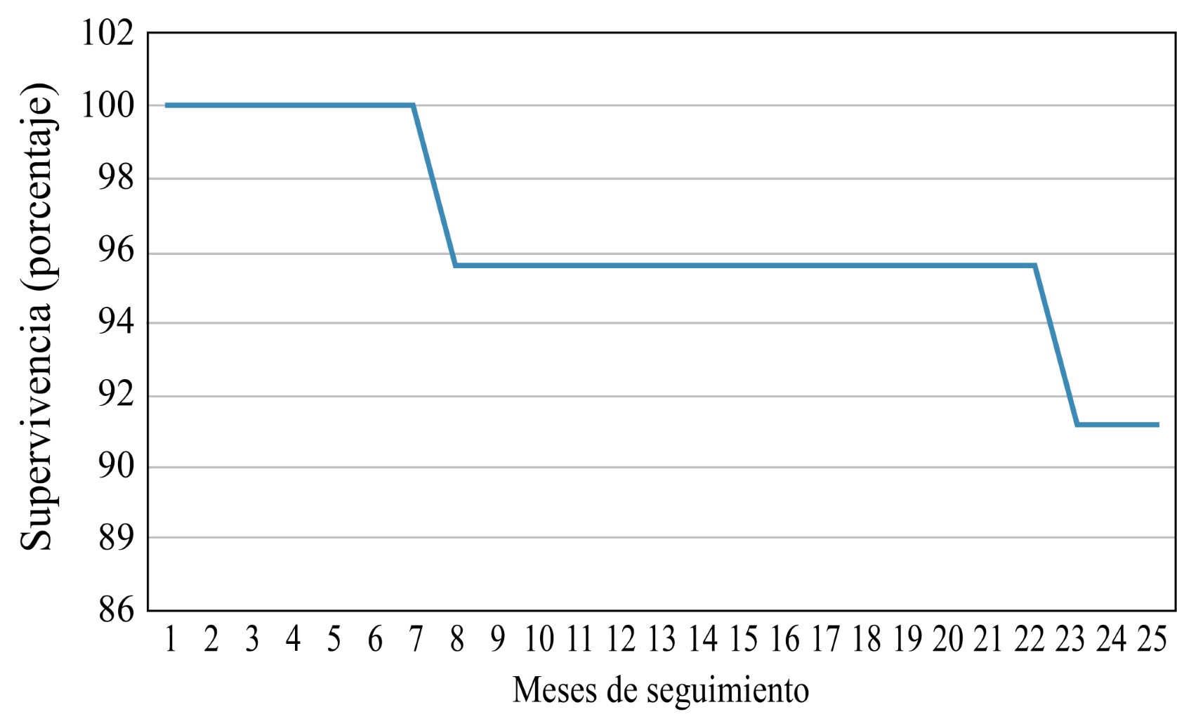 El número total de pacientes analizados fue de 23, sin pérdidas de seguimiento durante al menos 24 meses, con un seguimiento promedio de 29 meses para toda la serie. (Tabla 1).