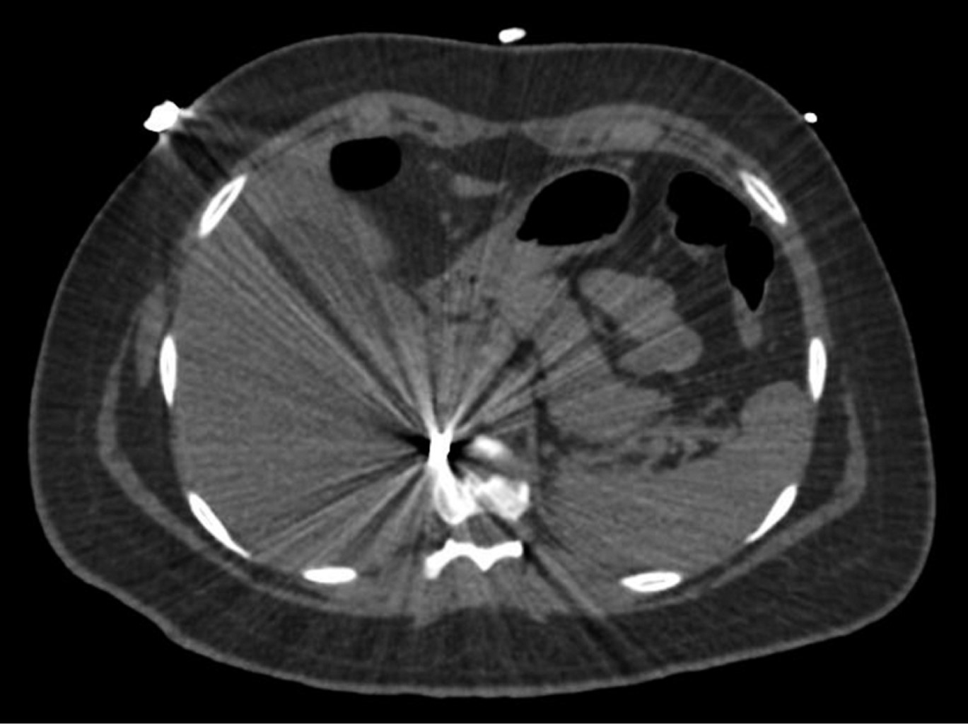 Paciente de 17 años, a su ingreso a urgencias refirió haber sufrido un traumatismo por PAF penetrante de abdomen. Sólo aquejaba dolor torácico leve a nivel del orificio de entrada del PAF, por lo que se le indicó paracetamol 1 g cada 8 horas, así como ceftriaxona 1 g cada 12 horas, ambos por vía intravenosa.