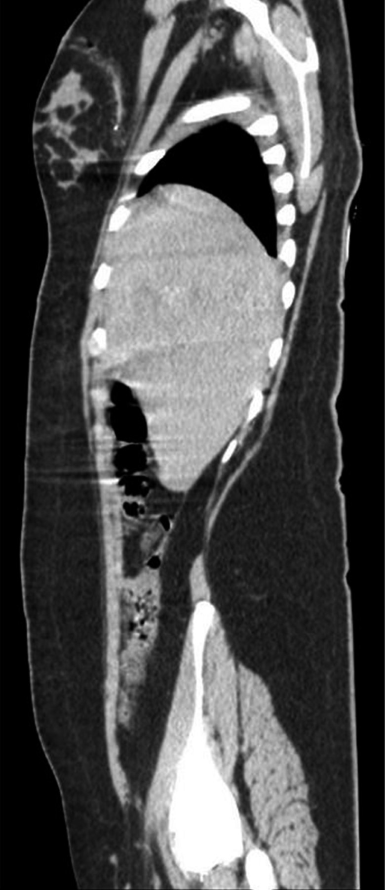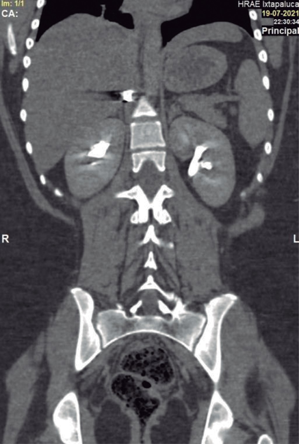 En la exploración física, sus signos vitales fueron los siguientes: frecuencia cardiaca: 74 latidos/minuto; tensión arterial: 98/67 mmHg; frecuencia respiratoria: 19/minuto, temperatura de 36 °C y saturación de oxígeno: 98%. En tórax presentaba un orificio de entrada de PAF en el cuadrante superior externo de la mama derecha (Figura 1), los campos pulmonares estaban bien ventilados. El abdomen era plano, con peristalsis, blando y sin dolor a la palpación. La biometría hemática reportó lo siguiente: hemoglobina: 12.8 g/dl, hematocrito 36.4% y leucocitos: 6,400/ml. La radiografía de tórax descartó neumotórax (Figura 2). Una TC de tórax y abdomen mostró un cuerpo extraño metálico alojado en la línea parasagital derecha a nivel de la doceava vértebra torácica (Figura 3), sin lesión pulmonar ni diafragmática (Figuras 4 y 5); en abdomen se observó un trayecto por PAF con lesión hepática grado IV de 12 cm por 2.3 cm en los segmentos IV, VII y VIII de Couinaud (Figura 5), líquido libre escaso, sin lesión de ningún otro órgano (Figuras 3, 5 y 6). Veinticuatro horas después se le realizó una TC de control, evidenciando la lesión hepática sin colección subcapsular ni extravasación activa a la aplicación del medio de contraste, sin aumento del líquido libre. Ante la correlación de estos hallazgos con la estabilidad clínica, se egresó a la paciente al cuarto día de su ingreso. Sin complicaciones un mes después de su alta.