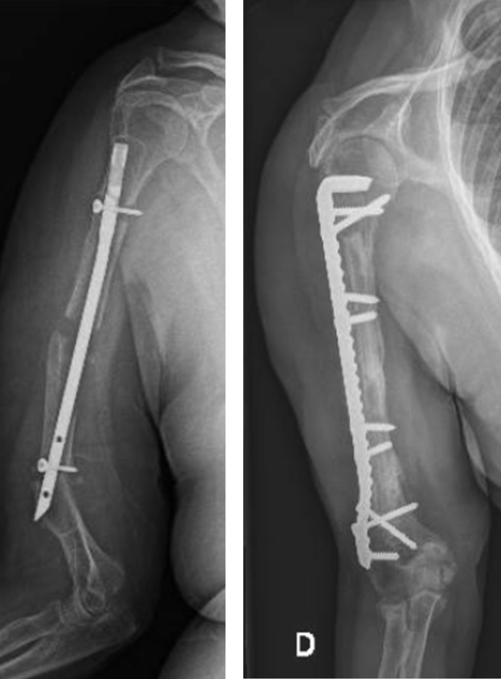 Las fracturas de húmero representan 0.5 a 5% de todas las fracturas,1,2 son más frecuentes en el sexo femenino, particularmente prevalentes en mayores de 50 años y se asocian con frecuencia a osteoporosis.3 Diez a 15% de las fracturas diafisarias de húmero pueden evolucionar hacia una no-consolidación;1,4 los reportes bibliográficos evidencian mayores porcentajes de no-consolidación luego de la estabilización de estas fracturas con clavos intramedulares.5,6 Los principales factores que predisponen al desarrollo de no-consolidación en fracturas diafisarias de húmero son: patrones complejos de fractura, cirugías previas, infección, pérdida ósea, medicamentos inmunosupresores, desvitalización de tejidos blandos, fumar, alcoholismo, diabetes, obesidad, antiinflamatorios no esteroideos (AINE), deficiencia de vitamina D y falta de adhesión a las indicaciones postoperatorias.1,7,8