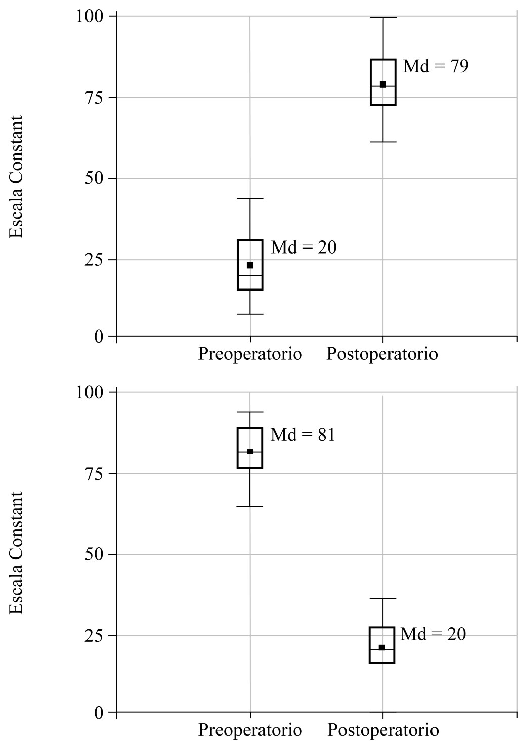 El seguimiento promedió 69 meses (rango: 24 a 144). Se obtuvo consolidación clínica y radiográfica en todos los casos luego de un promedio de 4.68 meses (rango: 3 a 7). Una paciente sufrió neuropraxia transitoria del nervio radial, la cual se recuperó completamente antes del quinto mes postoperatorio. Ningún paciente requirió de procedimientos quirúrgicos adicionales. Los pacientes que presentaban infección activa están actualmente libres de infección. El DASH en el último control promedió 20.27 puntos (rango: 0 a 36) y el Constant al último seguimiento promedió 79.31 puntos (rango: 61 a 100). La diferencia en los puntajes entre el preoperatorio y el postoperatorio fue estadísticamente significativa con una p = 0.0001 (Tabla 4 y Figura 4). La escala analógica del dolor al último control promedió 0.77 puntos (rango: 0 a 3).