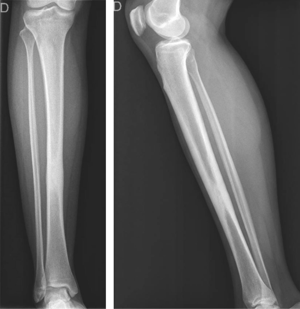 En la exploración física se encontró dolor a la palpación en la prominencia ósea de la tibia, a nivel del tercio medio. La movilidad activa de la rodilla y el tobillo era completa, además no se observaron alteraciones neurovasculares asociadas.
