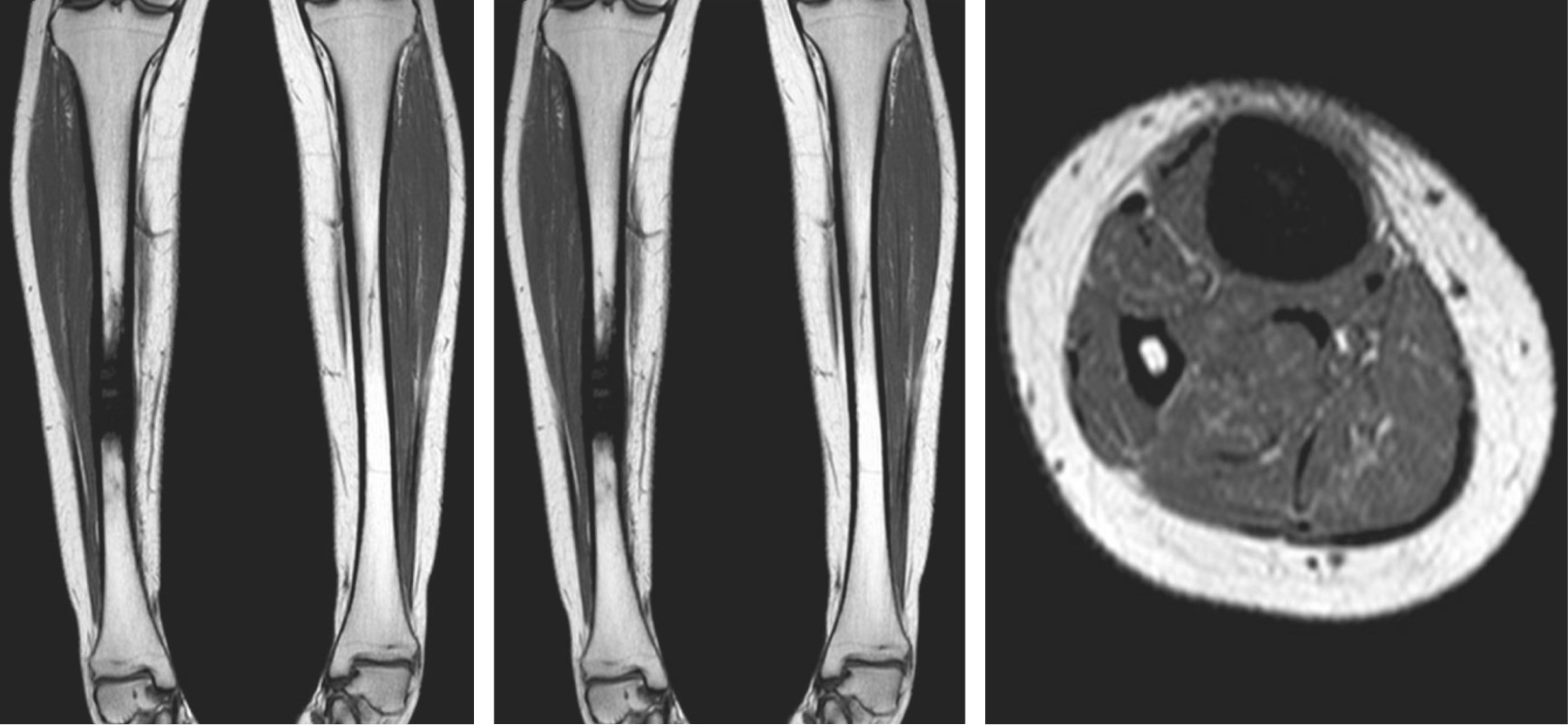 Se realizaron radiografías que demostraron una lesión intraósea diafisiaria única, de localización central, con bordes definidos, periostio engrosado pero sin interrupción y sin signos de malignidad. No se observó afectación de los tejidos blandos ni destrucción ósea adyacente (Figura 1). La resonancia magnética confirmó los hallazgos descritos; la lesión se caracterizó como inespecífica, con apariencia esclerosa y ocupación de toda la cavidad medular, con engrosamiento de ambas corticales (Figura 2). Se realizó una gammagrafía ósea que demostró una posible reacción osteogénica avanzada con evidencia de patología inflamatoria secundaria a destrucción ósea. Se realizó una biopsia incisional cerrada, que descartó lesiones infecciosas o neoplásicas.