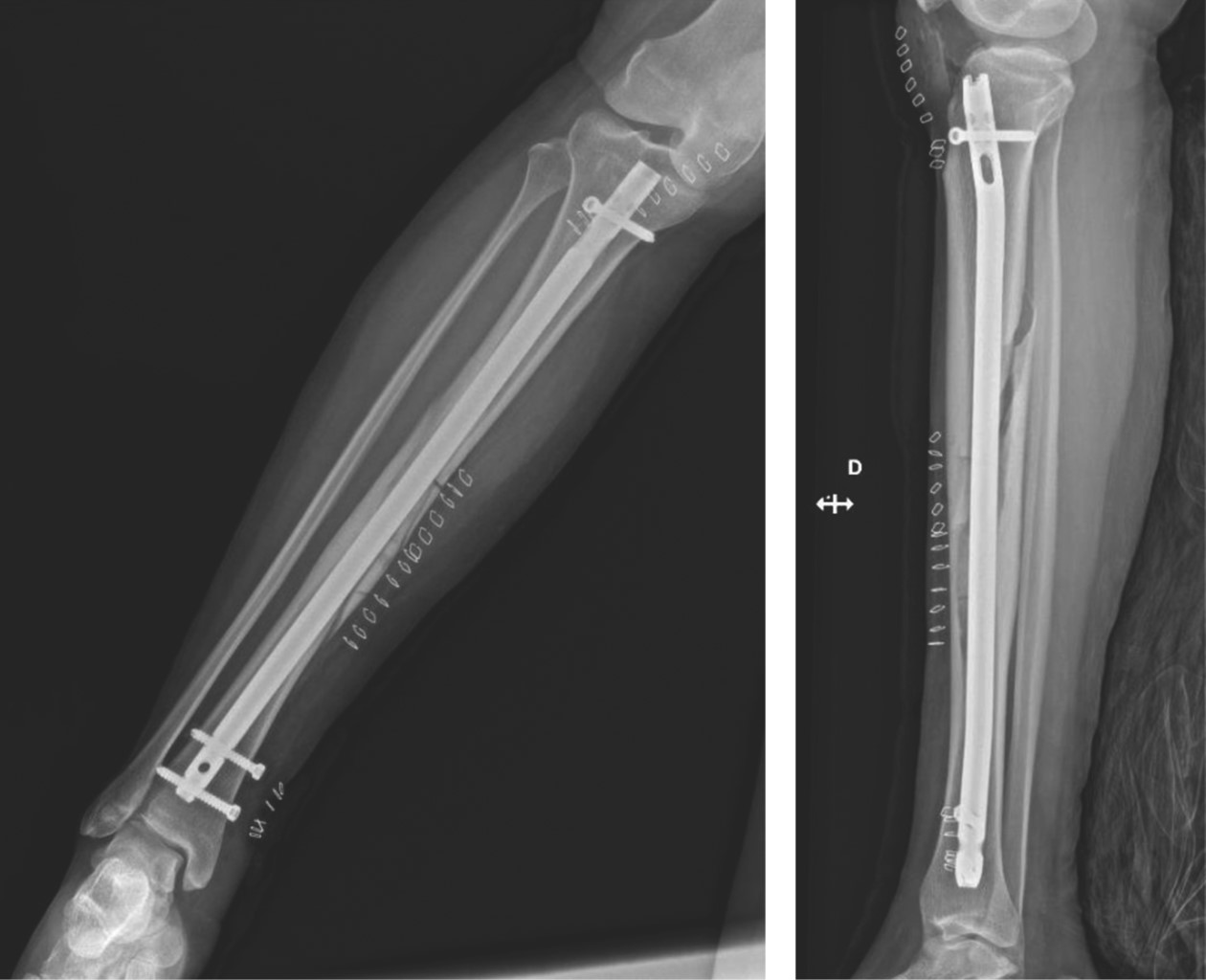 Se realizó enclavado endomedular de tibia, con imposibilidad de progresión del fresado a través de la lesión. Se realizó una ventana ósea anterior y limpieza de foco lesional. Durante el procedimiento, se produjo una fractura espiroidea proximal de tibia, que quedó bien reducida tras la osteosíntesis.