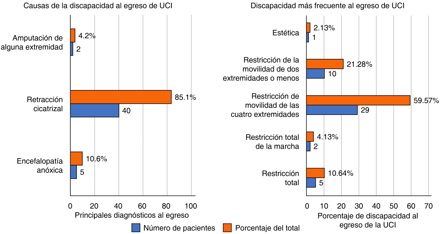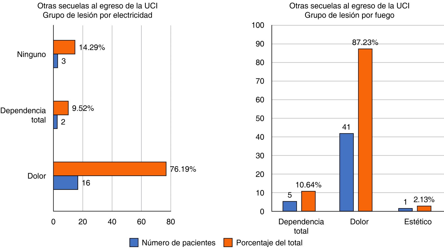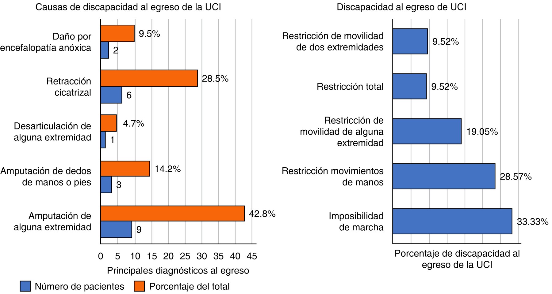 En México existen reportes que indican cómo la discapacidad en grupos vulnerables que sufren lesiones asociadas a caídas y traumas están asociadas a un alto índice de morbimortalidad. Si analizamos el grupo de lesiones secundarias a quemaduras por fuego y lesión eléctrica, son las que más se asocian a este tipo de complicaciones a largo plazo. En México no existen reportes de las causas y las principales secuelas al egreso de la UCI de este grupo de pacientes. En este estudio se confirmó como el grupo con mayor vulnerabilidad el sexo masculino, mismo patrón que se observa a nivel nacional y que confirma el rol de género observado en este tipo de lesiones accidentales. En este estudio se observó también cómo las consecuencia de la discapacidad al egreso de la UCI dependen del origen y la gravedad de la lesión; en el grupo de los pacientes con lesión por electricidad, alrededor de 60% tuvieron amputación de una extremidad, dedos de manos o pies y desarticulación de una extremidad que se refleja en más de 30% de la imposibilidad a la marcha, o la restricción del movimiento de una extremidad. Caso contrario a los supervivientes por quemaduras por fuego, donde la retracción cicatrizal de las extremidades (85.1%) fue la principal causa de limitación de la movilidad (59.5%).11