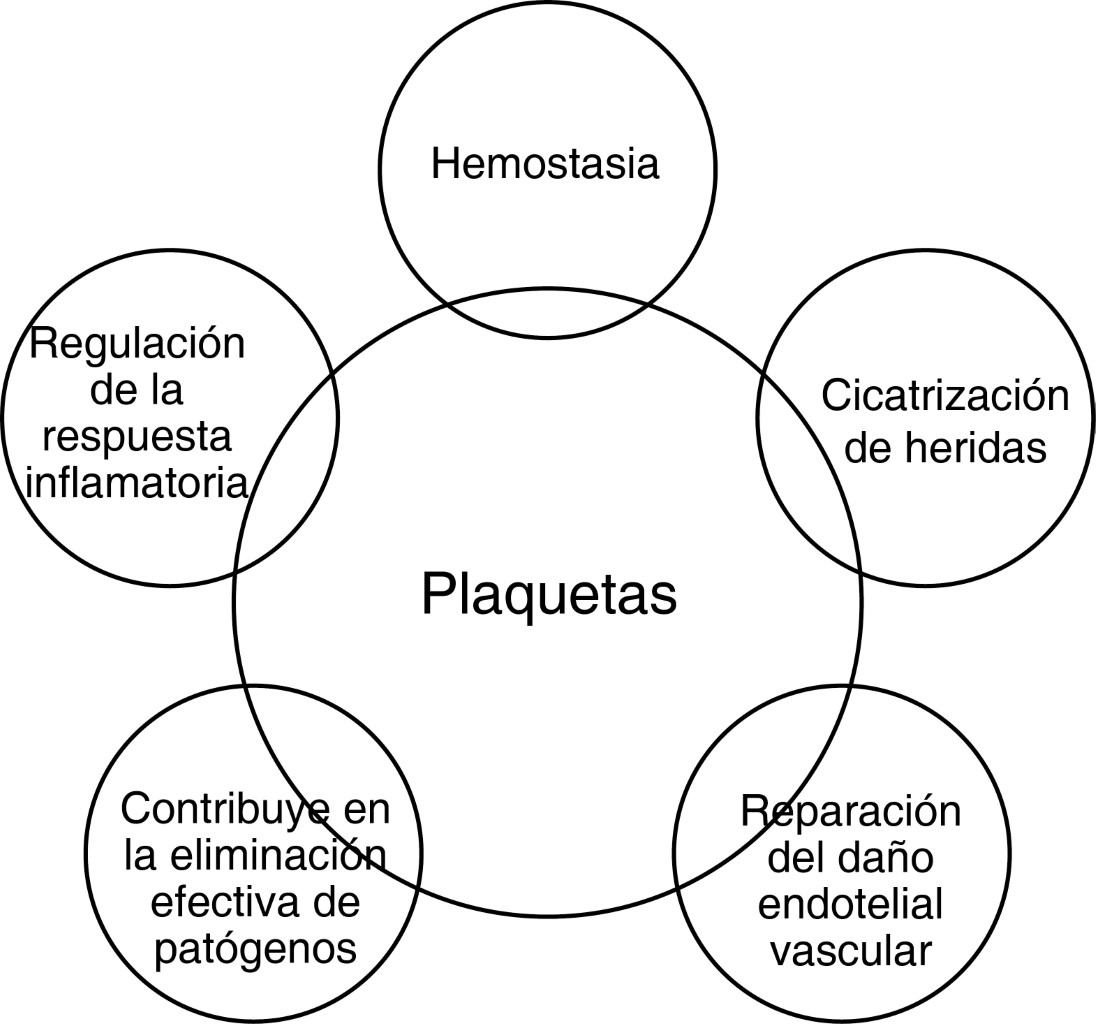 Por lo tanto, las plaquetas son fragmentos celulares anucleares circulantes, reconocidas ampliamente por su participación en la hemostasia; sin embargo, éstas también tienen un papel importante en el proceso de cicatrización de heridas y en la reparación del daño endotelial vascular a través de la expresión de citoquinas prorreparadoras y factores de crecimiento y también funciones inmunológicas complejas como parte de la actividad del sistema inmune innato, contribuyendo a la eliminación efectiva de patógenos y regulando la respuesta inflamatoria ante la presencia de moléculas exógenas patrones moleculares específicos asociados a patógenos (PAMP's) o endógenas patrones moleculares asociados a daño (DAMP's), ya que expresan receptores tipo toll (TLR's)-2 y TLR-4, que se unen a las lipoproteínas bacterianas, iniciando una respuesta que favorece la actividad inflamatoria en lugar de la respuesta agregatoria.3,4