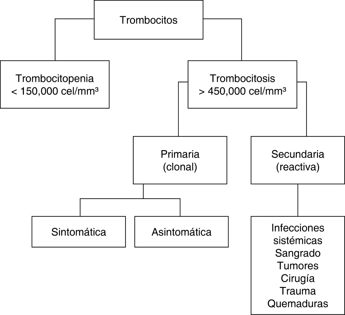 Las trombocitosis secundarias: se presentan en respuesta a estímulos inflamatorios múltiples, incluyendo infecciones sistémicas, condiciones inflamatorias crónicas, sangrado, tumores, cirugía, trauma, quemaduras, etcétera. Esta trombocitosis es secundaria a elevación en los niveles endógenos de TPO, IL-1, IL-3, IL-4, IL-6, IL-11, INF-G, INF-A y catecolaminas; se ha relacionado con mayor producción hepática de TPO y estimulación de la megacariopoyesis, favoreciendo cifras elevadas de plaquetas en sangre. En estas situaciones, el recuento plaquetario suele ser < 1'000,000/mm3,6 (Figura 4).