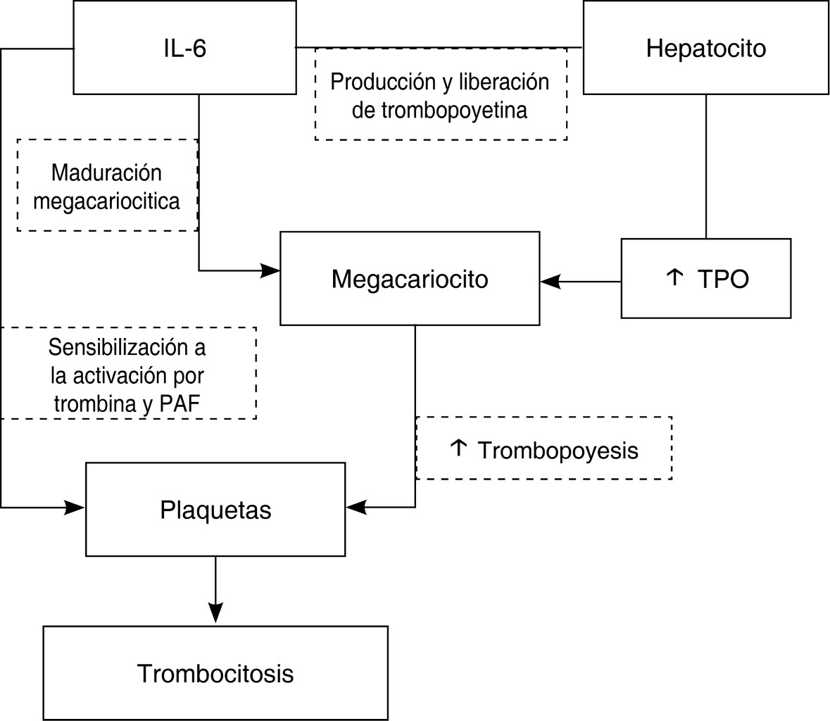 Se ha demostrado que la IL-6 promueve la maduración megacariocítica in vitro. In vivo, la IL-6 tiene efectos sobre los megacariocitos, como el aumento del tamaño, la ploidía y la producción de plaquetas. Además, altera la función plaquetaria al sensibilizarlas a la activación por trombina y el factor activador de plaquetas. Finalmente, la IL-6 también actúa directamente sobre los hepatocitos para estimular la producción y liberación hepática de TPO. Por lo tanto, la influencia de la IL-6 sobre las plaquetas parece estar relacionada directamente con la trombocitopoyesis, más que con el aumento de la vida de las plaquetas o con la disminución de su secuestro esplénico.7,8