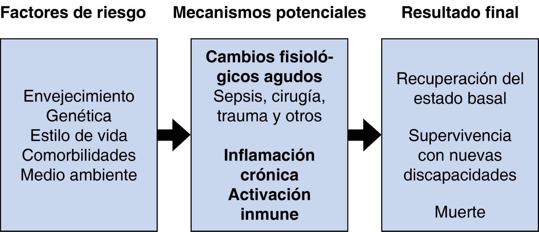 Los déficits asociados con la fragilidad, que normalmente tardan años en acumularse en la población geriátrica de pacientes ambulatorios, se desarrollan rápidamente en una gran proporción de pacientes en estado crítico, independientemente de la edad y la gravedad de la enfermedad. Estas características incluyen atrofia muscular, debilidad clínicamente significativa y estado funcional deficiente.18 Los mecanismos fisiopatológicos adicionales propuestos para estos hallazgos han incluido la inmovilización, la suplementación nutricional subóptima y la utilización ineficaz de sustratos.18 Uno de los principales desafíos continúa siendo identificar la "fragilidad silenciosa" (es decir, el envejecimiento normal que da como resultado una disminución de las reservas fisiológicas), utilizando el concepto geriátrico de homeostasis.18