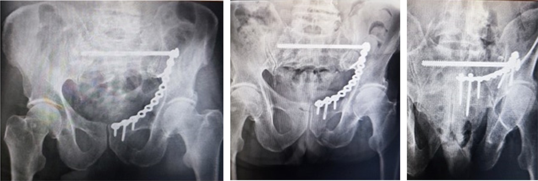 Tres pacientes fueron tratados secuencialmente con cirugía de control de daños (Figura 3) (con fijador supra-acetabular) y la osteosíntesis definitiva se realizó entre el tercero y octavo día de hospitalización.