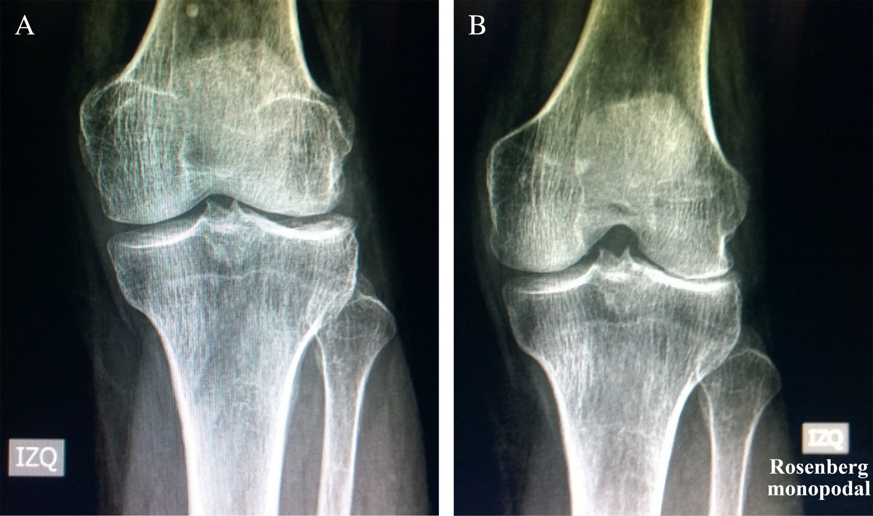 Radiografías con carga anteroposterior y lateral, Rosenberg o schuss (Figura 1).10 Radiografías axiales de patela en 20 grados. Telerradiografía de extremidades inferiores.