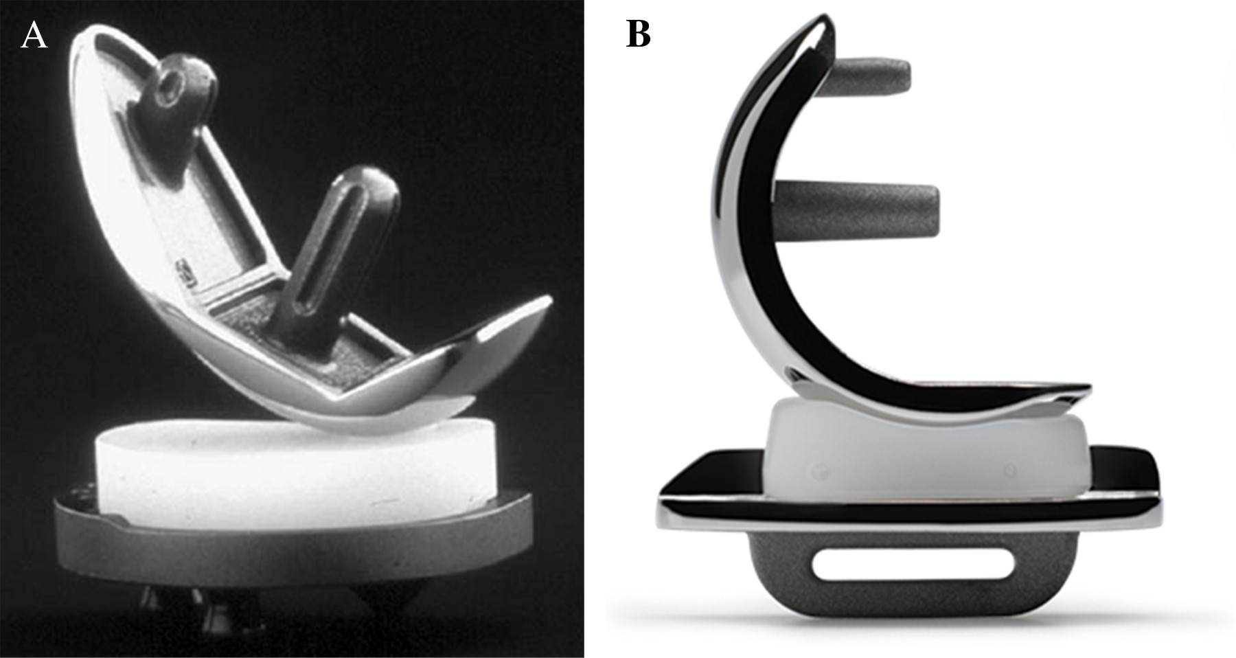 Al decir que los resultados han mejorado por los progresos de los implantes, es porque existen dos líneas que tienen un largo seguimiento. La de platillo móvil de la Escuela de Oxford donde el concepto es que disminuye el desgaste y la producción de partículas al poder disminuir la fricción en un punto o una línea fija de la superficie del inserto. A pesar de que algunos trabajos experimentales han demostrado que el número de partículas no es menor que en las fijas, la supervivencia de los implantes es lo suficientemente larga como para obtener resultados comparables con las de platillo fijo (Figura 4). Estas últimas tienen la ventaja de casi no correr el riesgo de que se luxe el plástico y que, por lo mismo, se puedan ocupar en el compartimiento lateral, más móvil sin inconvenientes. Pero tendrían menos margen para tolerar una posición más allá de lo recomendado en cuanto a la fricción que ocurriría sobre el plástico, que en las de inserto móvil.