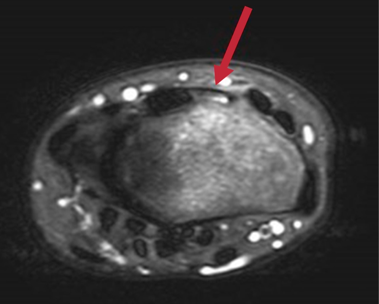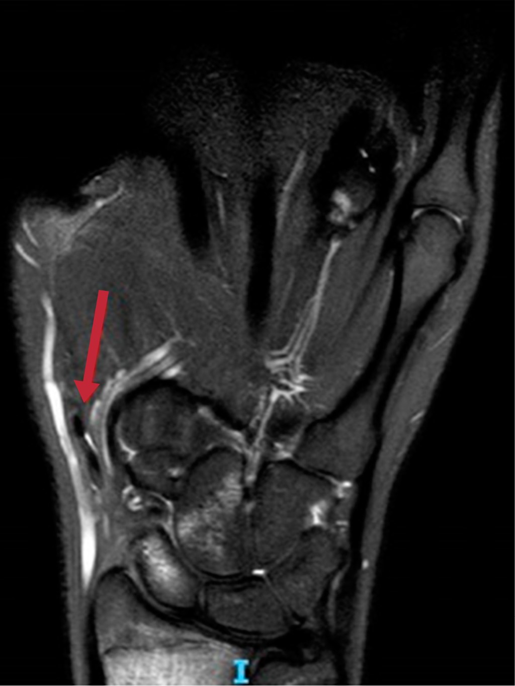 Una adolescente femenino de 13 años sin antecedentes médico-quirúrgicos de interés acude a Urgencias por dolor e impotencia funcional en muñeca izquierda tras caída mientras patinaba. Diagnosticada de lesión en torus metafisaria con extensión fisaria de radio distal clasificada como lesión Peterson tipo I (Figura 1), es inmovilizada durante cuatro semanas con férula antebraquiopalmar. Dos semanas después de la retirada de la férula, acude nuevamente a Urgencias al sentir un crujido en la muñeca, sin sobreesfuerzo asociado e impotencia para movilizar el primer dedo de la mano izquierda. Clínicamente presenta déficit de extensión activa interfalángica, efecto tenodesis patológico, edema local y asimetría macroscópica a la comparación con la extremidad contralateral (Figuras 2 y 3). Se estudia con resonancia magnética nuclear (RMN), identificando imagen de solución de continuidad del EPL (Figuras 4 y 5). Con la paciente bajo anestesia general, se procede al tratamiento quirúrgico mediante transferencia tendinosa del extensor propio del índice (EPI) al remanente distal del EPL con sutura tipo Pulvertaft de monofilamento no absorbible. En el postoperatorio se inmovilizó la extremidad las cuatro primeras semanas.