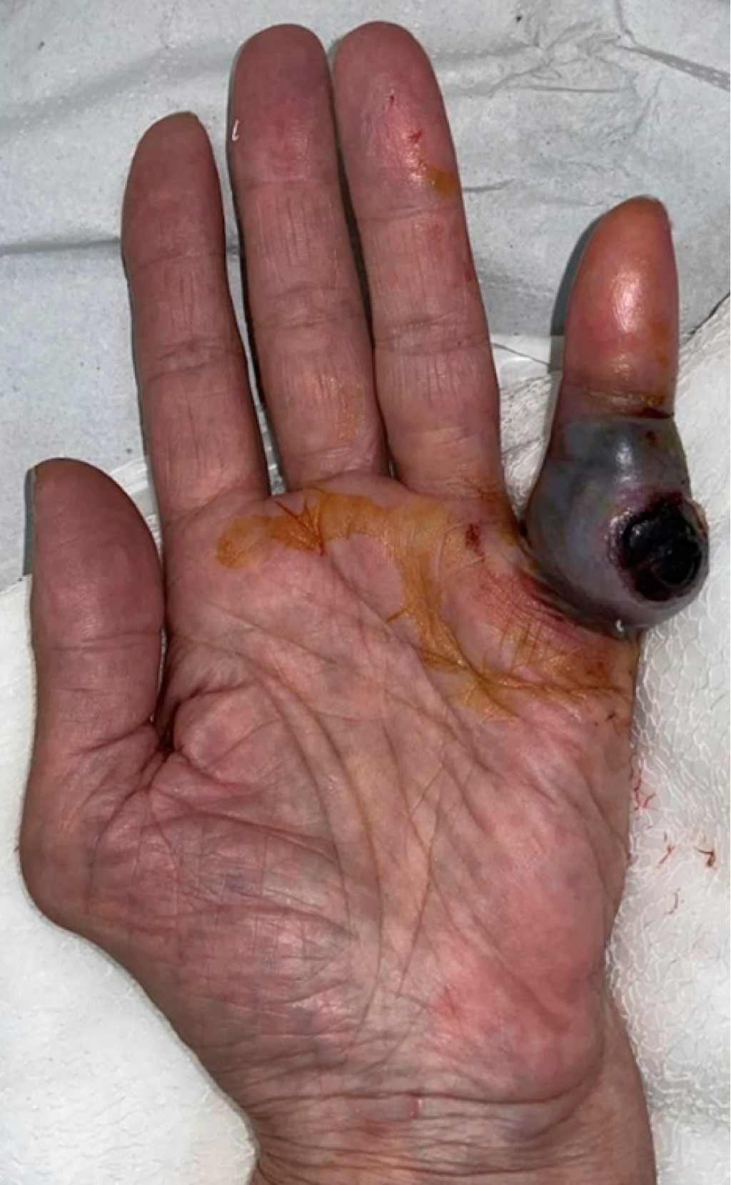 Paciente femenino de 79 años de edad, diestra, que consulta por un cuadro clínico de un mes y medio de evolución, caracterizado por la presencia de una tumoración necrótica en el borde cubital del quinto dedo de la mano izquierda (Figura 1). La paciente refiere haber sufrido una herida cortante con un vidrio en la región donde se desarrolló posteriormente la tumoración. Inicialmente evaluada en consultorio para seguimiento de la herida; refiere la aparición de dicha tumoración y el crecimiento progresivo de la misma un mes después del traumatismo inicial. Al examen físico, presentaba una lesión tumoral exofítica de 3 cm de diámetro, negra, ulcerada, con signos de sufrimiento cutáneo perilesional en relación con la falange proximal, sin signos de sangrado activo al momento de la evaluación. A su vez, presentaba hipoestesia del borde cubital del dedo, objetivando una capacidad de discriminación de dos puntos de 15 mm.