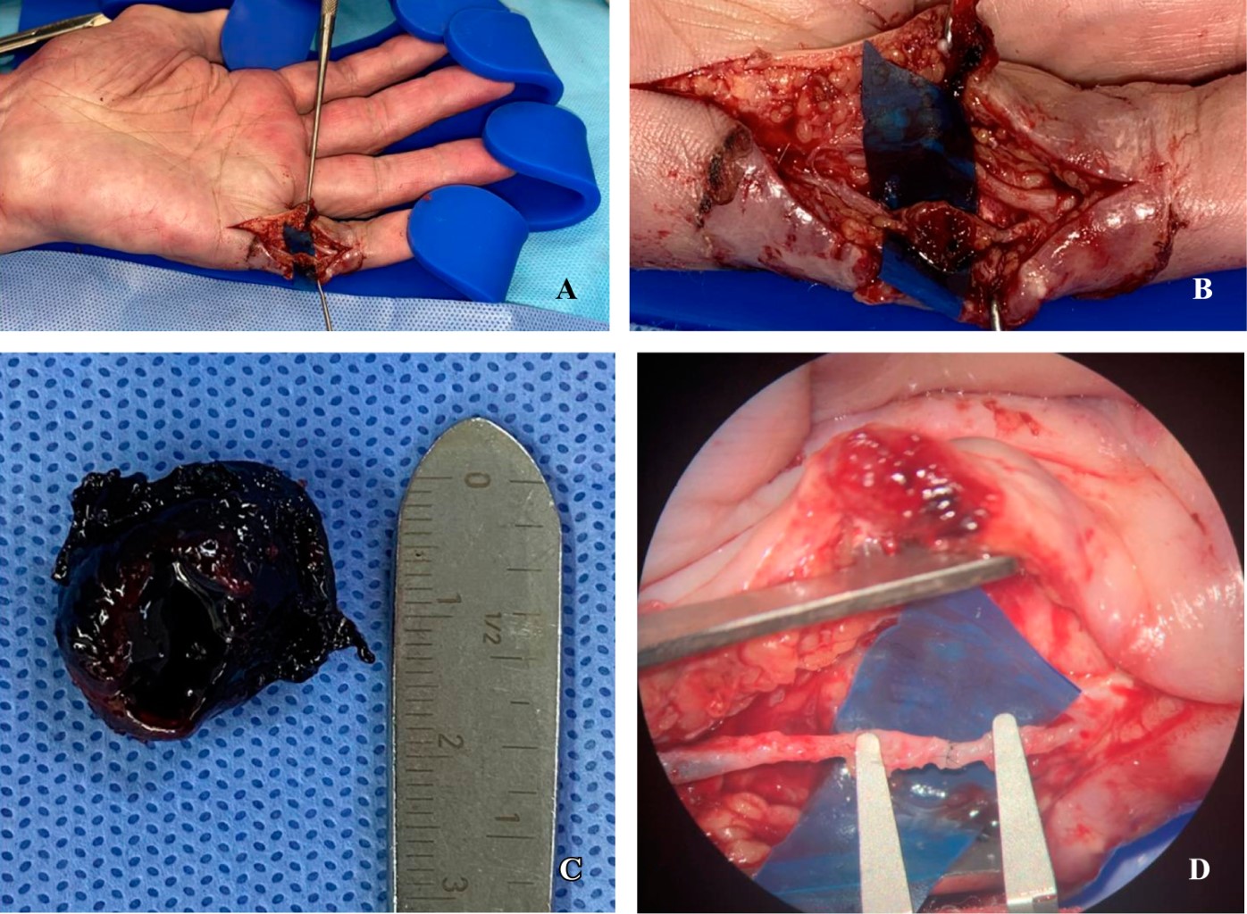 La paciente había realizado una ecografía y una angiografía que informaban la presencia de una imagen hipoecogénica de 10 × 7 mm que podría corresponder a un hematoma en la región dolorosa referida por la paciente (Figura 2). Debido a la evolución tórpida y el continuo crecimiento de la tumoración, se indicó la resección quirúrgica de la misma. El procedimiento quirúrgico fue realizado con la paciente en decúbito dorsal bajo anestesia general con su extremidad superior afectada sobre una mesa de mano. Mediante un abordaje volar de Bruner, se realizó la resección de la tumoración; se observó que la misma se encontraba en continuidad con la arteria digital colateral cubital del quinto dedo. La resección de la tumoración incluyó la excisión del segmento de la arteria digital que se encontraba en relación con la misma, ya que presentaba un daño irreparable. Posteriormente bajo magnificación microscópica se realizó lavado con heparina de ambos cabos arteriales y se realizó una arteriorrafia término-terminal de la arteria digital colateral cubital del quinto dedo mediante técnica microquirúrgica, utilizando Nylon 10-0. Posteriormente, se retiró el manguito hemostático, constatando permeabilidad de la sutura vascular. Asimismo, durante el procedimiento quirúrgico se comprobó la indemnidad del nervio colateral cubital, por lo que sólo se realizó una neurólisis del mismo (Figura 3).