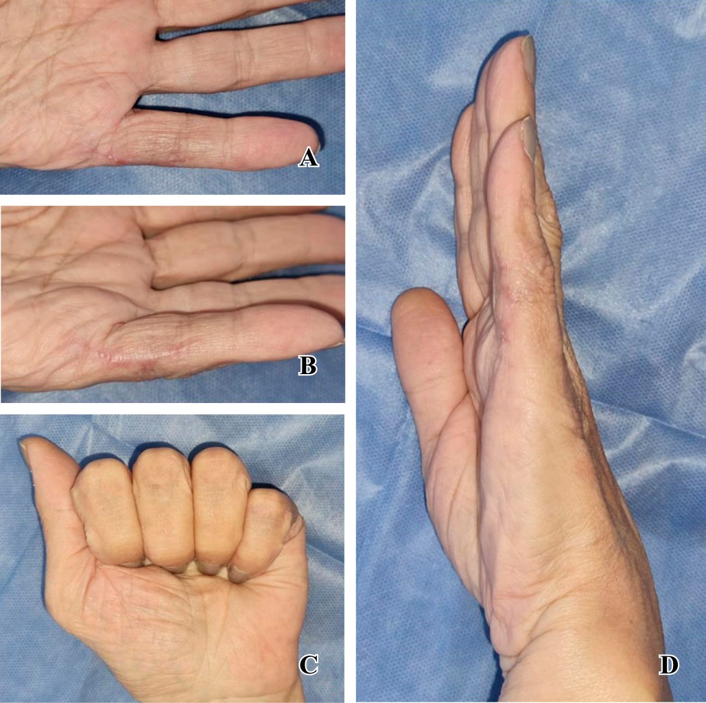 En el período postoperatorio inmediato, se efectuó una inmovilización con una valva de yeso antebraquiopalmar en intrínseco plus para proteger la sutura vascular. A las dos semanas, se retiraron los puntos cutáneos y se inició la rehabilitación de la movilidad del dedo.