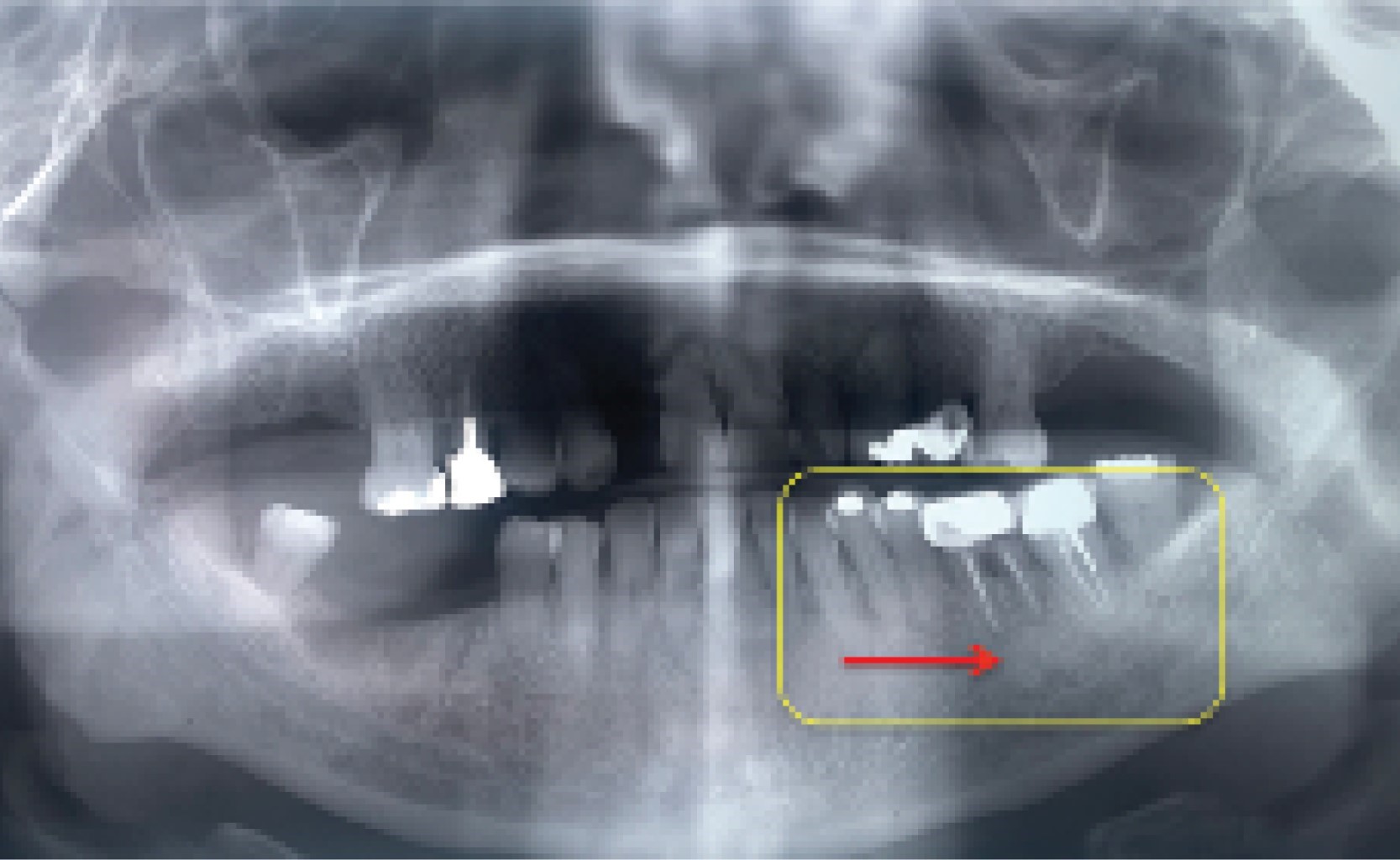 Paciente femenino de 69 años de edad, quien acudió en abril de 2016 a consulta por presentar dolor en hemimandíbula izquierda secundario a curetaje periodontal abierto realizado tres semanas previo a su consulta. Como padecimientos importantes la paciente presentó carcinoma de mama izquierda en 2006 que se trató con resección quirúrgica y quimioterapia. Colocación de prótesis de cadera izquierda en 2009 y administración de ácido zoledrónico vía intravenosa cada dos meses hasta la actualidad. A la exploración física inicial se encontró aumento de volumen en región de cuerpo mandibular izquierdo, movilidad dental grado II-III en órganos dentarios 36 y 37, encía de la región mencionada eritematosa y presencia de exudado serohemático a la compresión de la región. Se decidió manejo inicial solicitando radiografía panorámica (Figura 1), se administró amoxicilina-ácido clavulánico 875/125 mg cada 12 horas durante tres meses, clorhexidina, se recomendó higiene oral exhaustiva, ibuprofeno para control del dolor, endodoncia del OD 36 y la extracción de los molares involucrados de oclusión. La paciente acudió inicialmente tres veces por semana a lavados y control y posteriormente, dos veces por semana. Presentó buena evolución hasta febrero de 2017 cuando se presentó con fístula intraoral con exudado purulento y secuestro óseo a nivel del OD 36 además de parestesia labial izquierda. Se decidió iniciar clindamicina 300 mg vía oral cada ocho horas, la cual no toleró de manera adecuada, por lo que a los 10 días se cambió por moxifloxacino 400 mg vía oral cada 24 horas durante un mes. Se le colocó ácido zoledrónico por indicación oncológica en noviembre de 2017. Se continuó con manejo conservador, antibióticos sistémicos, colutorios y clorhexidina tópica, analgésicos en caso de dolor, higiene oral estricta y consultas a lavado tres veces por semana durante un año. En septiembre de 2018 continuó con múltiples fístulas intraorales vestibulares y hueso expuesto en diversos puntos del cuadrante III. Se solicitó tomografía en la cual se observó osteólisis en hemimandíbula derecha sector posterior y hueso de características anormales en cuerpo mandibular izquierdo. En este punto se decidió no retirar órganos dentarios 36 y 37 hasta que tuvieran tejido de granulación en su porción apical y la extracción fuera, en medida de lo posible, sin exposición ósea. En octubre de 2019 se realizó extracción de 36 sin complicaciones y a la semana acudió con exudado purulento fétido y hueso necrótico en vestibular. Se realizaron curaciones diarias con buena evolución y se dieron citas dos veces por semana. En mayo de 2019 acudió con absceso submandibular izquierdo, que se drenó de manera extraoral, presentando 20 cm3 aproximadamente de exudado purulento. Se agregó metronidazol 500 mg vía oral cada 8 horas a esquema antibiótico y acudió a curaciones diarias sin complicaciones, la herida cicatrizó de manera espontánea. Se solicitó nueva radiografía panorámica en la que se observó franca lisis en cuadrante tres abarcando porción de la basal mandibular (Figura 2). En julio de 2019 se realizó extracción atraumática de 37 con adecuada evolución. En septiembre de 2019 continuó con hueso expuesto. Cabe resaltar que se tomaron cultivos de las fístulas y se aislaron Streptococcus anginosus y biopsias que reportaron hueso necrótico por el Servicio de Patología.