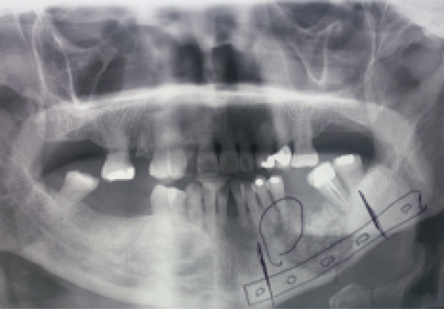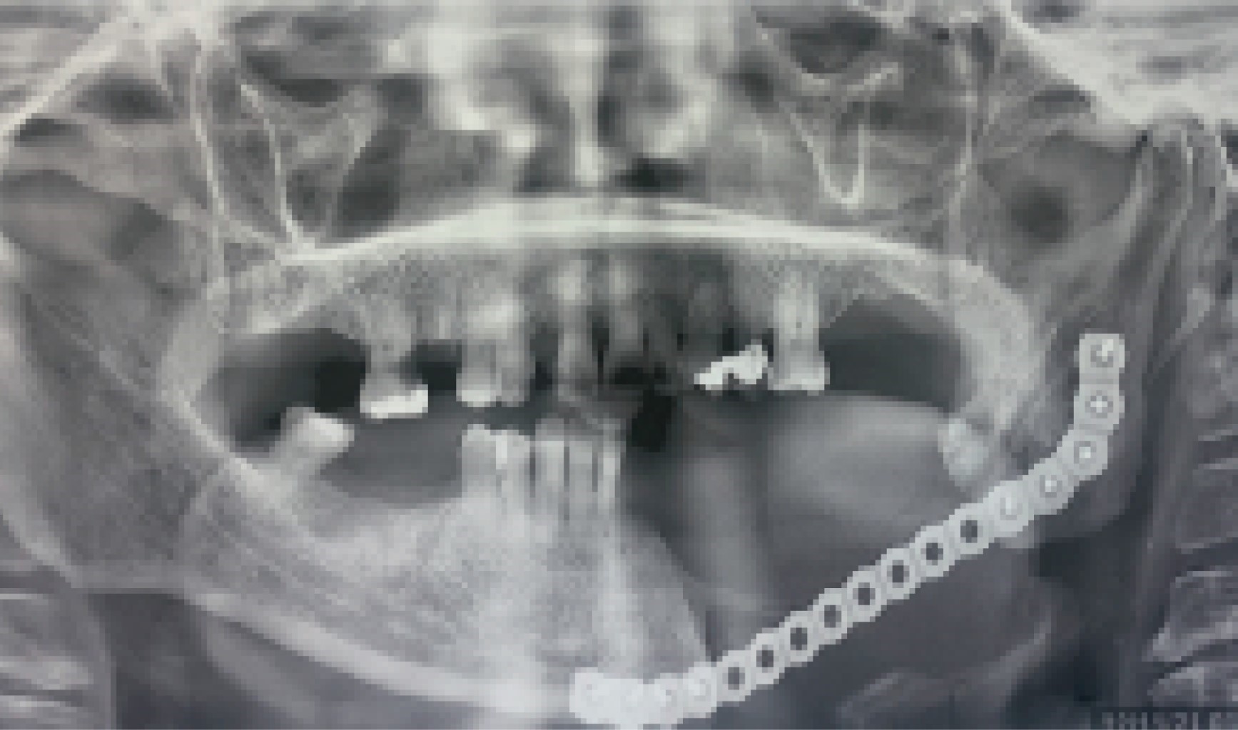 Presentamos un caso de osteonecrosis mandibular asociada a ácido zoledrónico, que por su condición médica general (descrita más adelante) se decidió manejar de forma conservadora durante cuatro años y tras no presentar ninguna mejoría ni estabilización de la enfermedad, en conjunto con la paciente y sus familiares se decidió realizar manejo quirúrgico. A continuación, se presenta resumen de caso clínico y manejo desde abril de 2016 hasta abril de 2022.