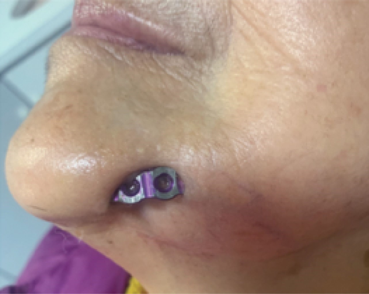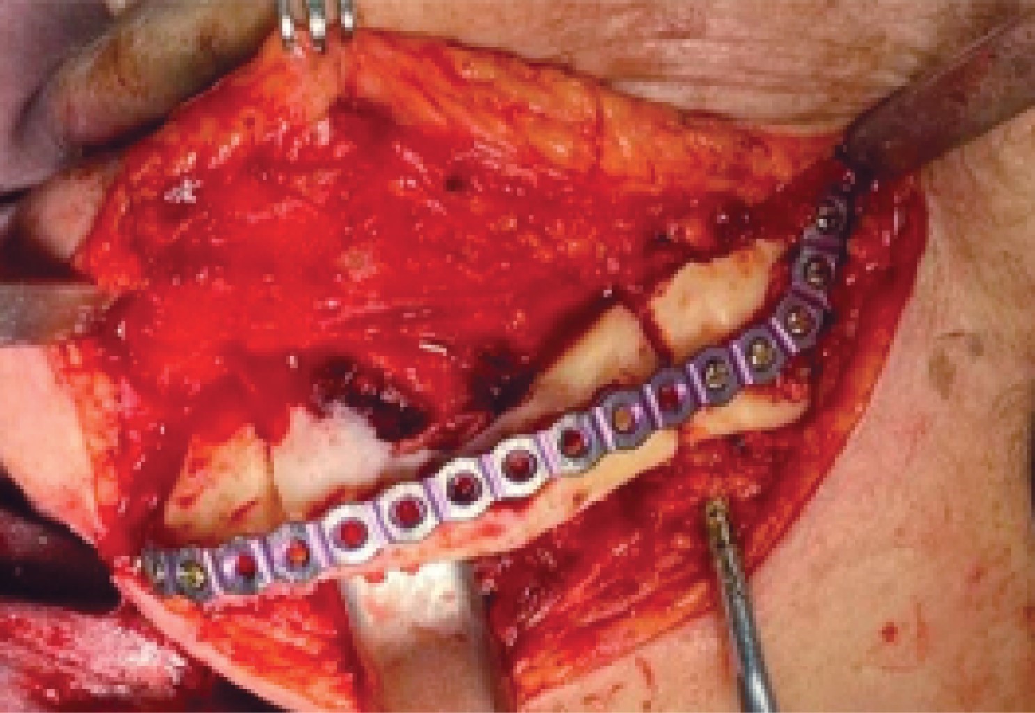 Dieciséis meses posterior al procedimiento quirúrgico se presentó exposición de la placa de manera extraoral sin datos de infección y sin datos de exposición intraoral de la misma (Figura 11). Se propusieron varias opciones como cambio de placa de reconstrucción, reutilización de la placa actual con previa esterilización y rotación de colgajo submental para cobertura de la placa, pero la paciente rechazó el tratamiento.