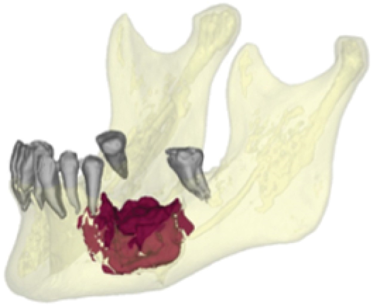 Posterior a un año de controles semanales y sin evidencia de ninguna mejoría posterior a las extracciones y manejo conservador, se decidió en conjunto con paciente y sus familiares manejo quirúrgico con resección mandibular izquierda, para lo que se solicitó TAC, reconstrucción 3D (Figuras 3 y 4), estereolitografía y todos los estudios de laboratorio pertinentes, así como valoración preoperatoria por cardiología, medicina interna y anestesiología, de igual manera el médico oncólogo tratante estuvo enterado y de acuerdo con el tratamiento propuesto.