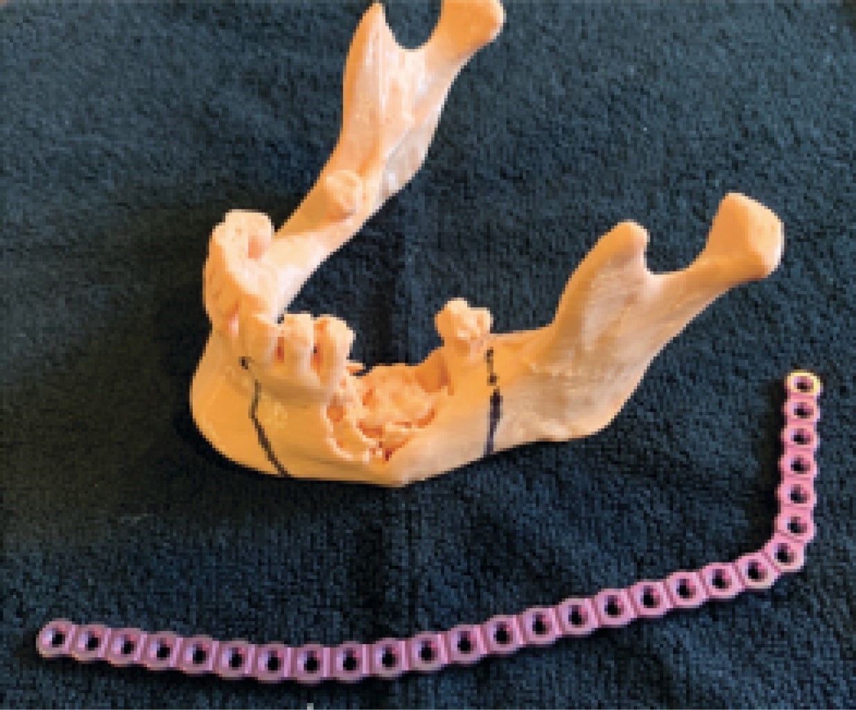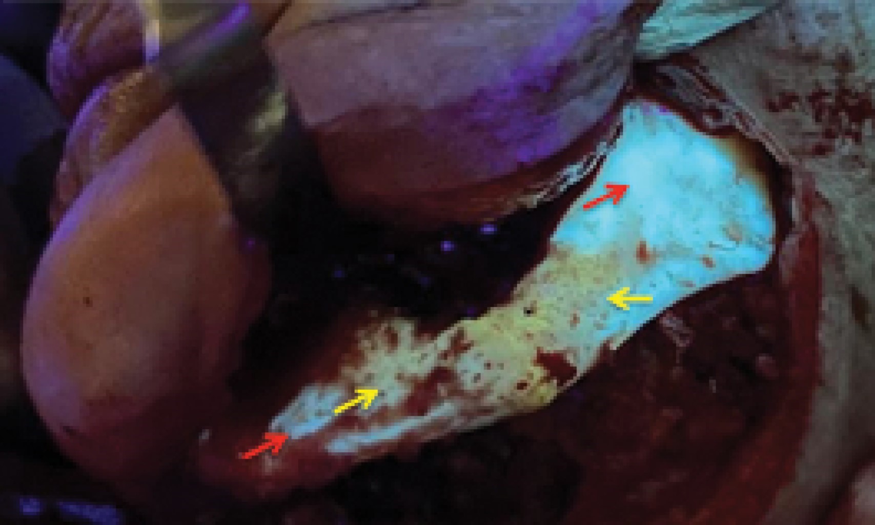 Bajo anestesia general balanceada con intubación nasotraqueal, se realizó asepsia y antisepsia de la zona a intervenir. Se hizo abordaje extraoral tipo Risdon con extensión submental, se expuso en su totalidad hemimandíbula izquierda (Figura 5). Se colocó y fijó placa de reconstrucción 2.4 alto perfil, la cual fue predoblada con la estereolitografía y esterilizada. Se fijó placa con cinco tornillos 2.4 bicorticales en el segmento proximal y cuatro tornillos 2.4 bicorticales en el segmento distal, todos los tornillos utilizados fueron bloqueados. Diez días previos al procedimiento se inició manejo con doxiciclina 300 mg cada 12 horas según el protocolo descrito por Putke y colegas, de técnica de fluorescencia transoperatoria (Figura 6). Posterior a esto se realizó la resección en bloque con bordes óseos sanos según lo planeado tomográficamente y lo visto clínicamente con la técnica de fluorescencia (Figura 7). Se colocaron múltiples membranas de plasma rico en factores de crecimiento (Figura 8) y se realizó hemostasia, cierre por planos hacia el piso de la boca y de abordaje de Risdon y se colocó Penrose de abordaje cervical. Se dio por terminado el procedimiento quirúrgico, enviando pieza quirúrgica a patología (Figura 9). La paciente cursó con un postoperatorio adecuado (Figura 10).