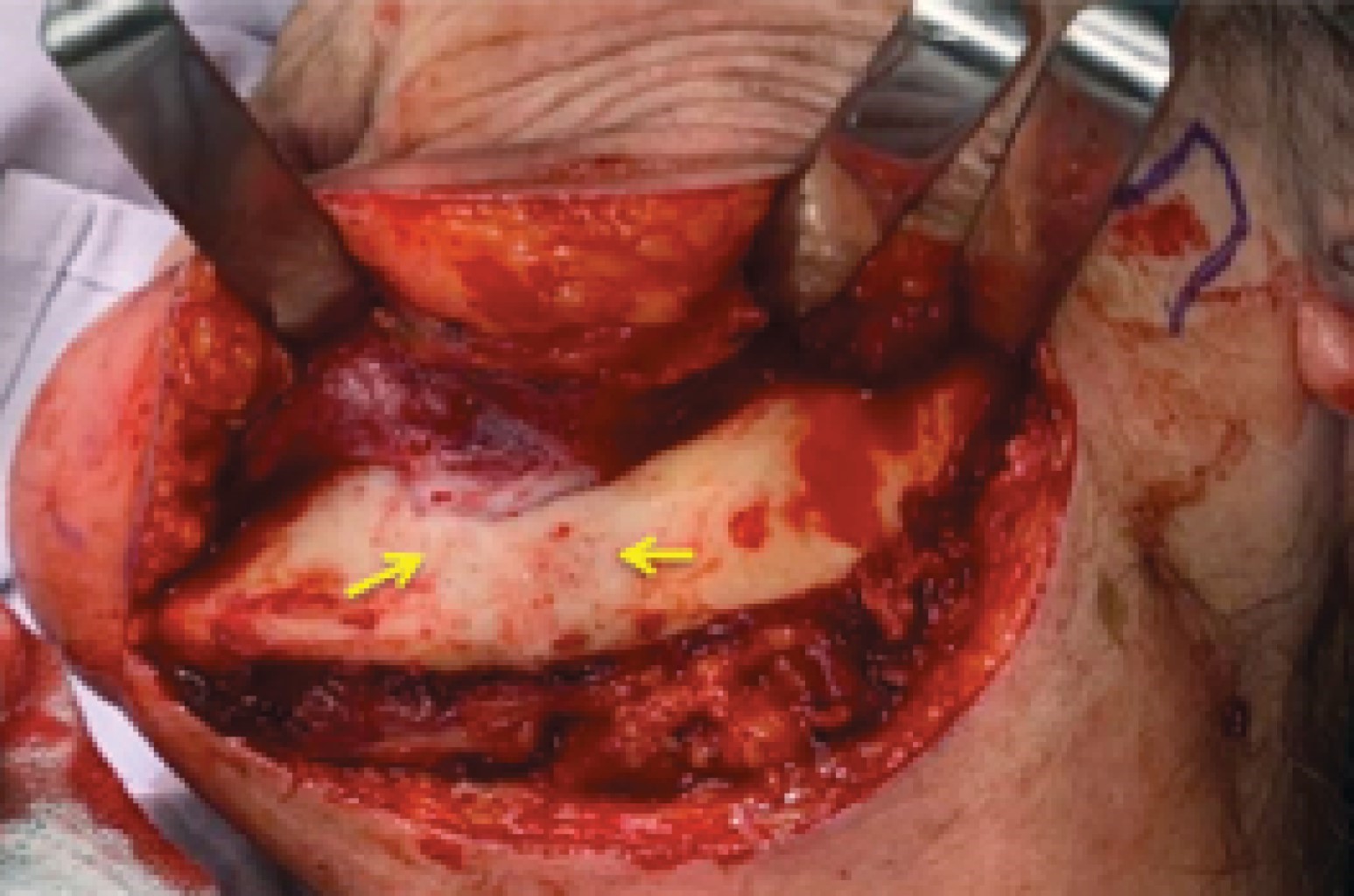 Uno de los mayores problemas a los que nos enfrentamos al planear y realizar nuestros procedimientos quirúrgicos es la extensión de la enfermedad, debido a que con frecuencia lo que vemos clínicamente no es la extensión completa de la enfermedad, con base en esto, la literatura menciona algunos métodos coadyuvantes durante la planeación y el procedimiento quirúrgico. Se pueden utilizar tomografías pre y transoperatorias, centellografía ósea y la resonancia magnética pueden guiarnos durante nuestro tratamiento. Además, existe una técnica relativamente nueva: fluorescencia guiada de manera transoperatoria. Esta técnica reportada por Pautke y colaboradores se ha sugerido para diferenciar el hueso vital del hueso necrótico. En esta técnica se le administra al paciente tetraciclina 10 días previos a la intervención y durante el procedimiento quirúrgico se aplica luz fluorescente al área afectada y existe diferencia visual clara del hueso necrótico (el cual se observa azul-pálido) al hueso vital (brilloso y fluorescente).25 Además, también se ha reportado el uso de plasma rico en plaquetas (PRP) y la terapia de láser de baja intensidad como coadyuvantes en los procesos quirúrgicos. El PRP es una fuente autóloga de una gran variedad de factores de crecimiento que se ha utilizado en pacientes a los que se practicó desbridamiento o resecciones, ayudando de manera importante en la cicatrización de los tejidos blandos.26 Por su parte, se ha demostrado que el láser de baja intensidad regula el metabolismo, ayuda a la cicatrización de tejidos blandos, reduce el dolor y minimiza la contaminación por microorganismos, por estas razones se recomienda el uso simultáneo con cualquier terapia en OMIM, en especial, los tratamientos quirúrgicos en los que se elimina el hueso necrótico.27