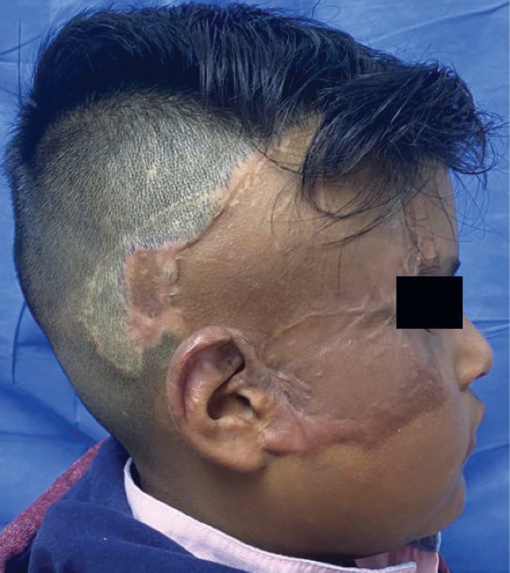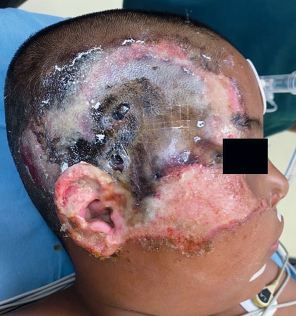 Paciente masculino de siete años sin antecedentes personales patológicos de importancia, que se presentó al Hospital Pediátrico de Tacubaya por quemadura por fuego directo en hemicara derecha con 3% de la superficie corporal total (SCT), producto de la explosión de un fuego pirotécnico, donde de inmediato se realizó curación de la herida (Figura 1).