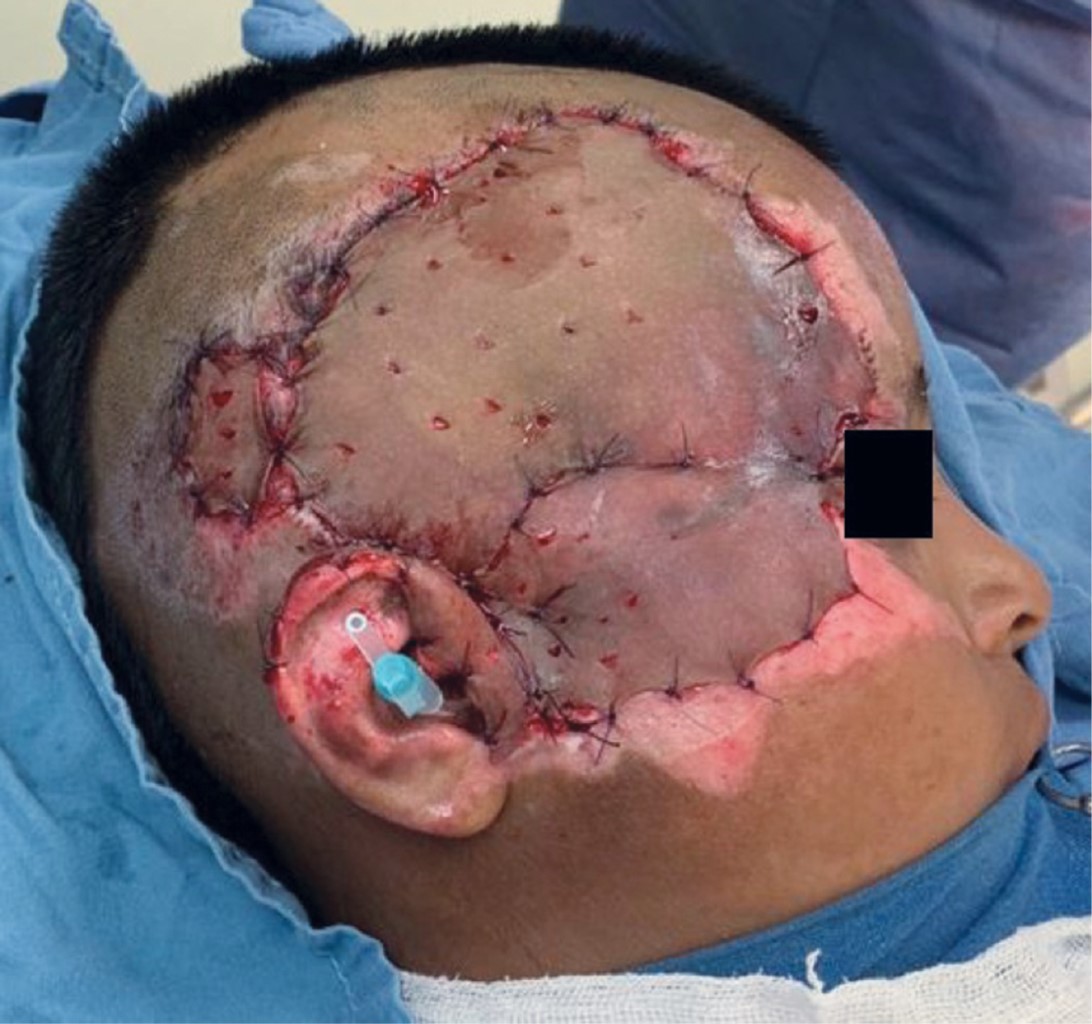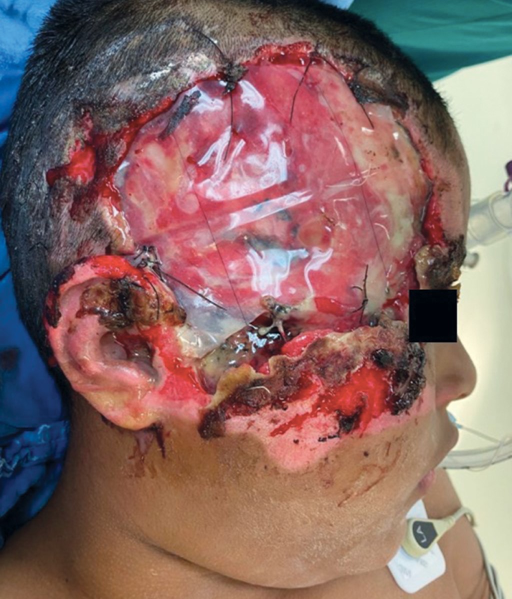 En la primera intervención quirúrgica se realizó escisión tangencial de la herida desde la región parietal hasta el canto externo del ojo derecho, quedando parte de la tabla ósea expuesta y del músculo temporal con vitalidad, donde se coloca una matriz dérmica de la marca Integra®.