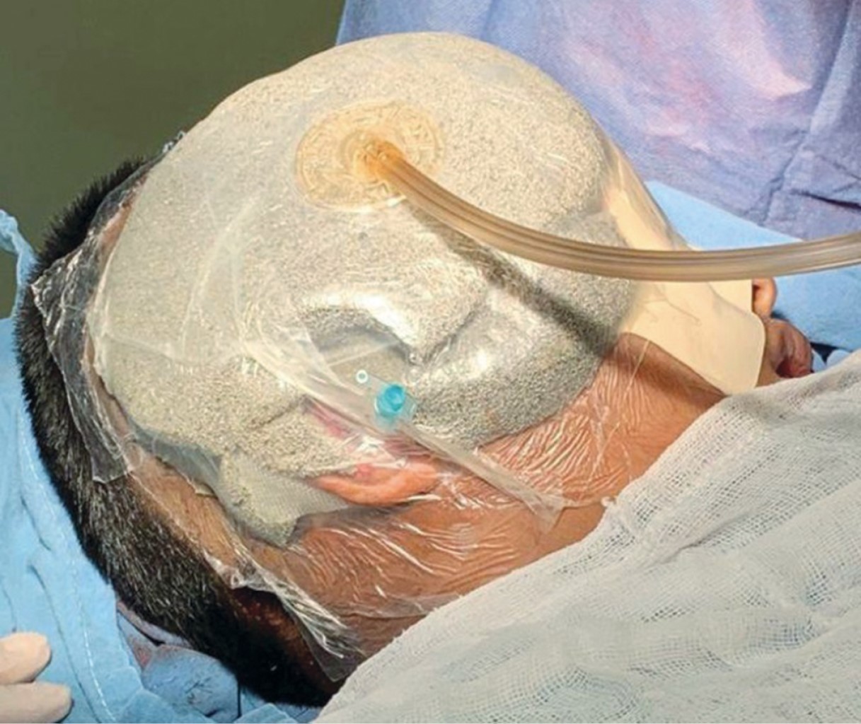 En una segunda intervención quirúrgica, se observó pérdida parcial de la matriz dérmica en la zona de la exposición ósea, por lo que se realizaron perforaciones óseas en la zona y un avance de colgajo preauricular y de región mastoidea, se colocó matriz dérmica de la marca MatriDerm® (Figura 2) en conjunto con sistema de presión negativa VAC (Figura 3).