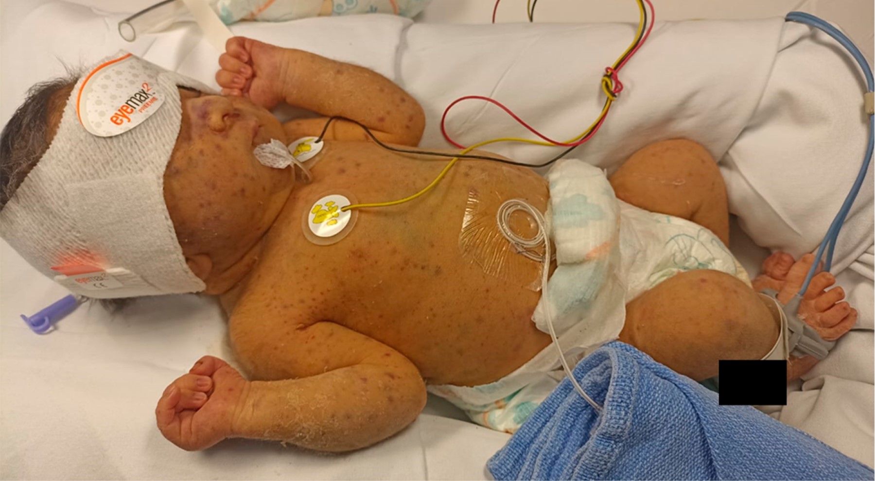 Nace producto vía abdominal por preeclampsia y sospecha de sufrimiento fetal. Peso: 2,420 g, talla: 49 cm, perímetro cefálico (PC) 30 cm p < 3. Capurro 39 SDG, APGAR 8-9. A la exploración física, exantema generalizado que afecta a todos los segmentos, caracterizado por máculas eritematovioláceas y petequias diseminadas (Figura 1). Ictericia generalizada, microcefalia, fontanela anterior 3 × 3 cm normotensa, fontanela posterior puntiforme, fondo de ojo normal, narinas sin secreciones, cardiopulmonar normal, abdomen blando, hepatomegalia de 5 cm por debajo de reborde costal, esplenomegalia de 6 cm, genitales masculinos sin alteraciones, extremidades íntegras, llenado capilar 2 segundos.