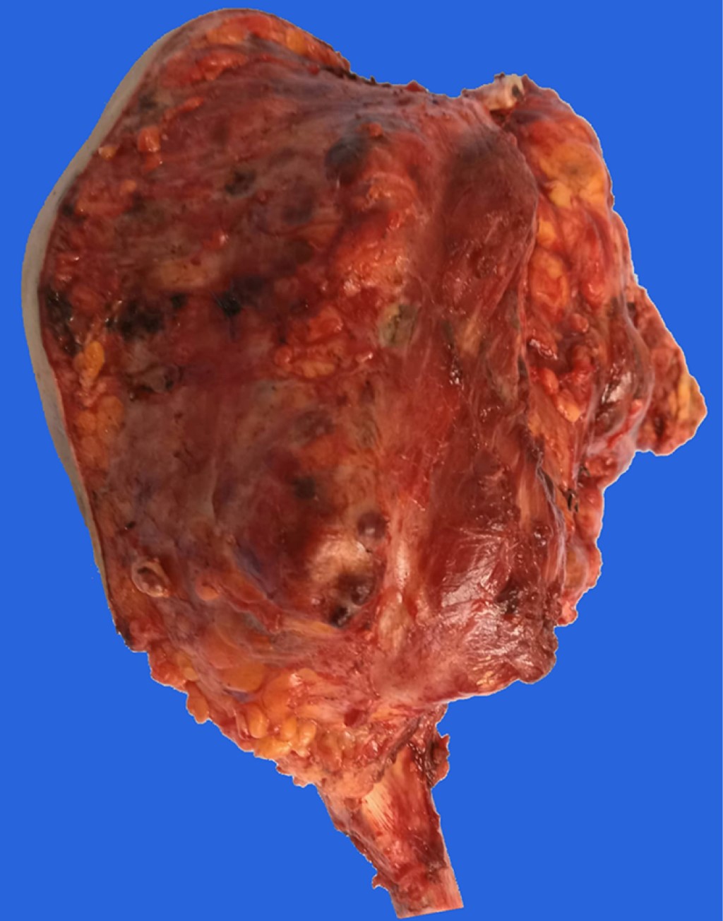La alternativa terapéutica en relación con la lesión primaria se tomó con base en las condiciones de la lesión. Se trató de una lesión en etapa 3 de Enneking9 y grado radiológico III de Campanacci,10 cuyas dimensiones y crecimiento hacia medial y posterior hicieron que la cortical anterior de la escápula se afectara y, por ende, no era posible separarlos sin contaminar el campo quirúrgico, situación que propiciaría una recurrencia tumoral. Pese a la abolición de la función del hombro y las importantes alteraciones estéticas esperadas, consideramos que las características del caso no permitían considerar otras opciones dentro de un margen reducido y fácilmente controlable y aceptable de complicaciones.