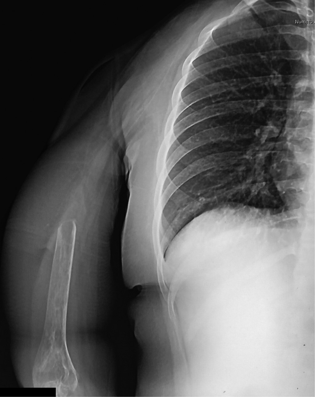 Paciente femenino de 17 años de edad, diestra, estudiante, que es enviada al Servicio de Ortopedia Pediátrica a consecuencia de tumor en el húmero proximal derecho. A simple vista se presenta importante aumento de volumen en el hombro derecho, así como limitación funcional principalmente a la abducción del hombro, así como parestesias distales. La función de hombro, muñeca y mano está conservada. Es difícil establecer el tiempo de evolución de la enfermedad, ya que existen contradicciones entre la versión de la paciente y la de sus padres; sin embargo, se considera que es de aproximadamente nueve meses, siendo su primera manifestación el aumento de volumen con progresiva disminución a la abducción. Esta lesión no había recibido tratamiento previo. Radiológicamente se trata de lesión osteolítica expansiva que muestra pérdida de la cortical y una sombra correspondiente a invasión neoplásica hacia los tejidos blandos circundantes (Figura 1). Tanto por tomografía como por resonancia magnética se observa el componente extracompartimental de la lesión, invasión articular y también a la escápula a expensas de permeación a la cortical anterior de la misma, así como gran desplazamiento medial de las estructuras neurovasculares, replegándolas hacia la parrilla costal (Figura 2). Una vez realizados estudio y análisis clínico e imagenológico, se realiza biopsia, la cual reporta tumor óseo de células gigantes. Se discute el caso y se llega a la conclusión de que la mejor alternativa terapéutica es una resección extraarticular de escápula con inclusión de más de la mitad proximal del húmero derechos. Previo al procedimiento quirúrgico se les informa detalladamente a los padres y a la paciente sobre el mismo, quienes lo autorizan. Dicho procedimiento se cataloga como resección tipo VI B de Malawer. El acto quirúrgico se llevó a cabo sin complicaciones, comentando que el grupo muscular de flexores del codo precisó de su resección en su mitad proximal, por lo que el remanente distal se reinsertó sobre la delgada fascia anterior del brazo (Figuras 3 y 4). Se inmovilizó la extremidad superior de la paciente por tres semanas y posteriormente se inició programa para reinicio de la función de la extremidad dentro de los rangos que la resección realizada permitió. A tres meses del evento quirúrgico, la función obtenida se estableció como 25/30 basados en el MSTS score (Figura 5). A los seis meses de vigilancia postoperatoria, por medio de tomografía computada, se detectó una lesión compatible con metástasis única pulmonar basal en el hemitórax derecho. Se revisaron estudios preoperatorios, no encontrándose indicio de que se tratara de una lesión ya existente al diagnóstico. Se solicitó valoración por cirugía oncológica, quienes determinan la realización de una minitoracotomía para realizar la metastatectomía correspondiente; se confirmó sospecha diagnóstica.